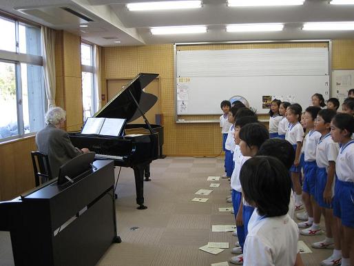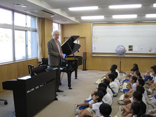 10月28日(金)、小学校の音楽室にて4年(P4)生を対象に「学校クラスコンサート」が実施されました。本校では、体験学習を重視する教育に取り組んでいますが、その一環として実施するものです。今回はPTNAかつらぎステーションの主催(後援:奈良県教育委員会)により、国際ピアニストとして幅広く活躍されているルイ・レーリンク先生(洗足学園大学講師)をお招きしました。 |