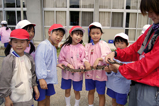 あいにくの暑さでぐったりした動物たちに、初めは恐々だった児童も、自分の体で日陰を作ってあげたり、ヒヨコやハムスターをを抱いたりしてやさしく接していました。また、スタッフの方に手伝っていただきながら、大きなニシキヘビに触れて、「つるつるしている」「あったかい!」と、初めての感触に感激する様子も見られました。