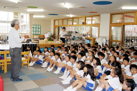 P4(小学4年生)の児童が本学園内の棚田で田植えを行いました。 まず初めに全員がオープンスペースで「奈良グリーンファーム」(大和郡山市)の飯田喜代視さんから、田植えの手順や注意事項の説明を受けた後、2クラスずつ順番に棚田へ移動しました。