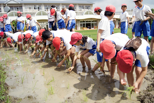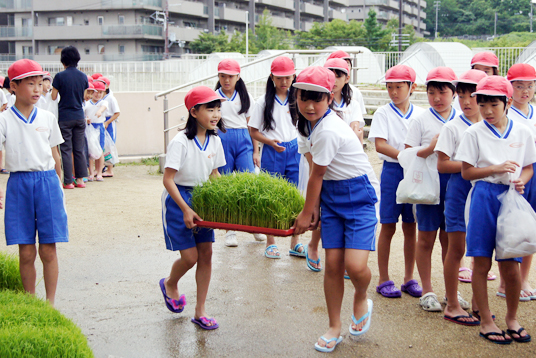 この田植え体験は、社会科の『農業体験』の授業の一環で、手植えを体験し育てることで、昔の人の苦労や生活を学んでもらおうというものです。 夏を目前にして、水の管理や草抜きなど大変な作業が山積みですが、児童たちは「楽しかった」「おいしいお米ができるかな?」と、秋の収穫を楽しみに、泥だらけの顔をほころばせていました。
