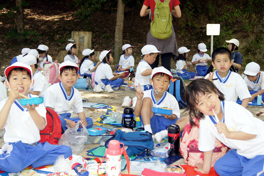 そして少年運動広場に移動すると、待ちに待ったお弁当の時間。みんなでおいしく、楽しくいただきました。その後、先生や友達とおやつを交換したり、かけっこをしたりしてはじめての遠足を満喫しました。