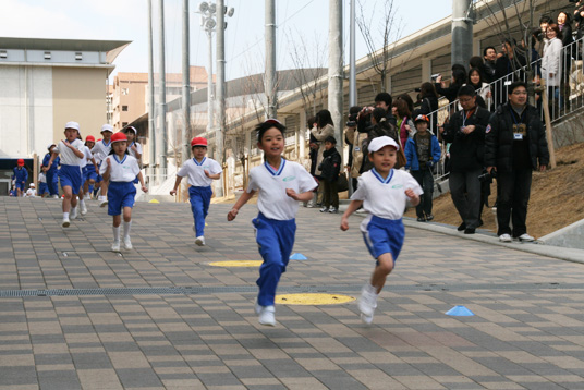 児童たちは学年ごとに集合し、念入りに準備体操を行った後、P1は1.2キロ、P2は1.5キロ、P3は2キロの完走を目指し、男女別にスタートしてタイムを計りました。