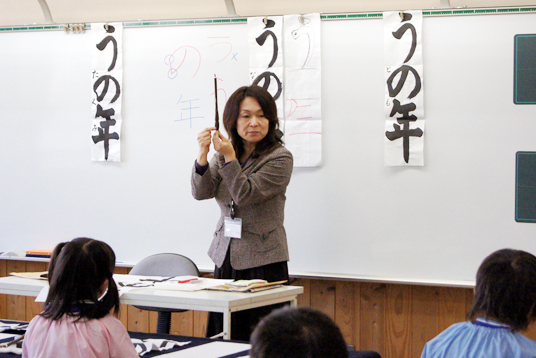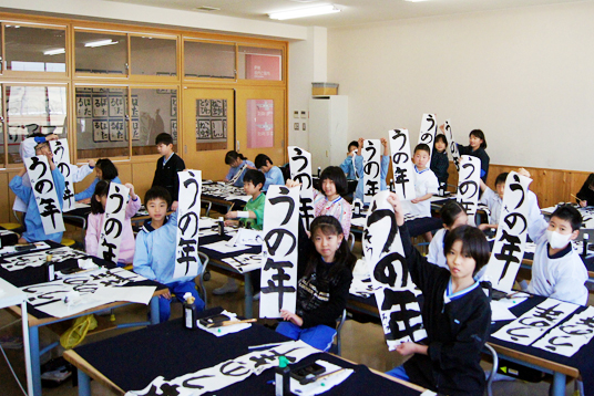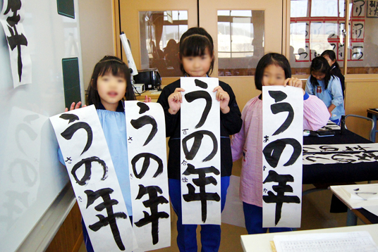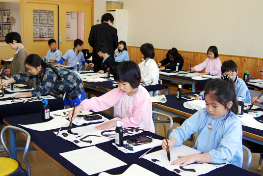 新春の行事として、P3学年の書き初め大会を行いました。毎年3学年より毛筆を用いた書写の授業を行っていますが、大きな紙に太筆で書くのは初めての体験とあって、児童たちも開始前から興味を持っている様子がうかがわれ、琴の音が流れる中「よろしくお願いします」の元気なあいさつでスタートしました。 |