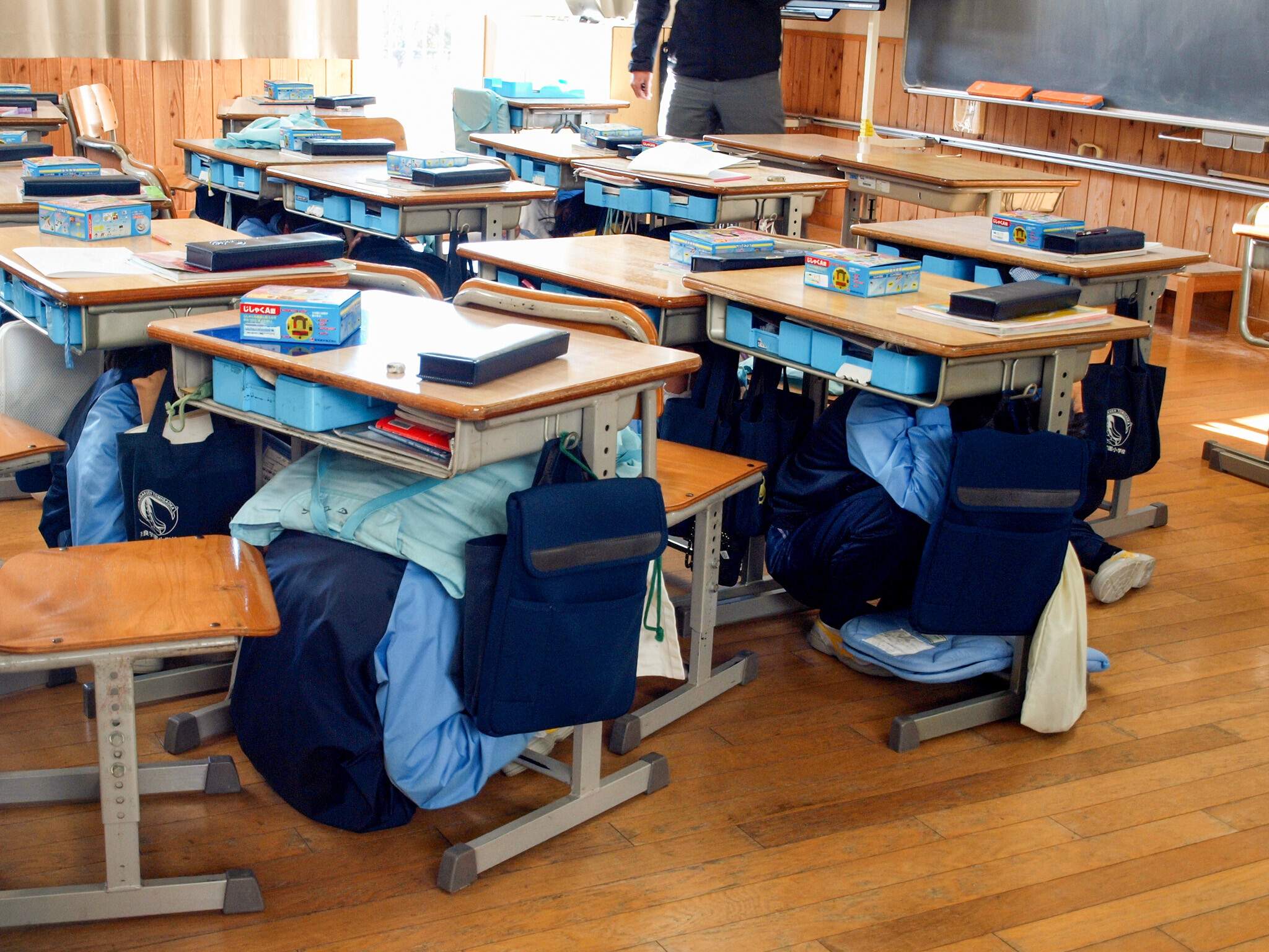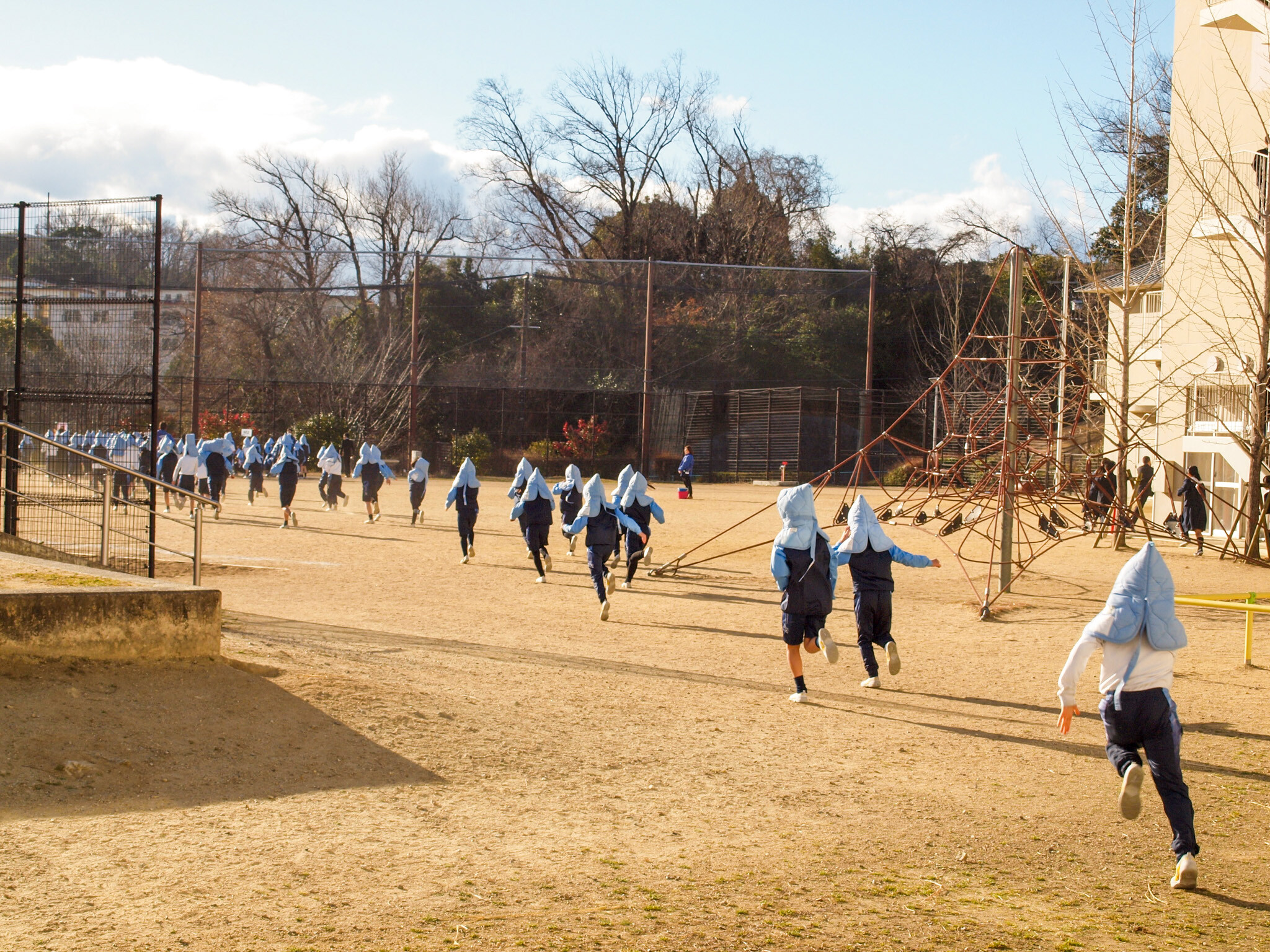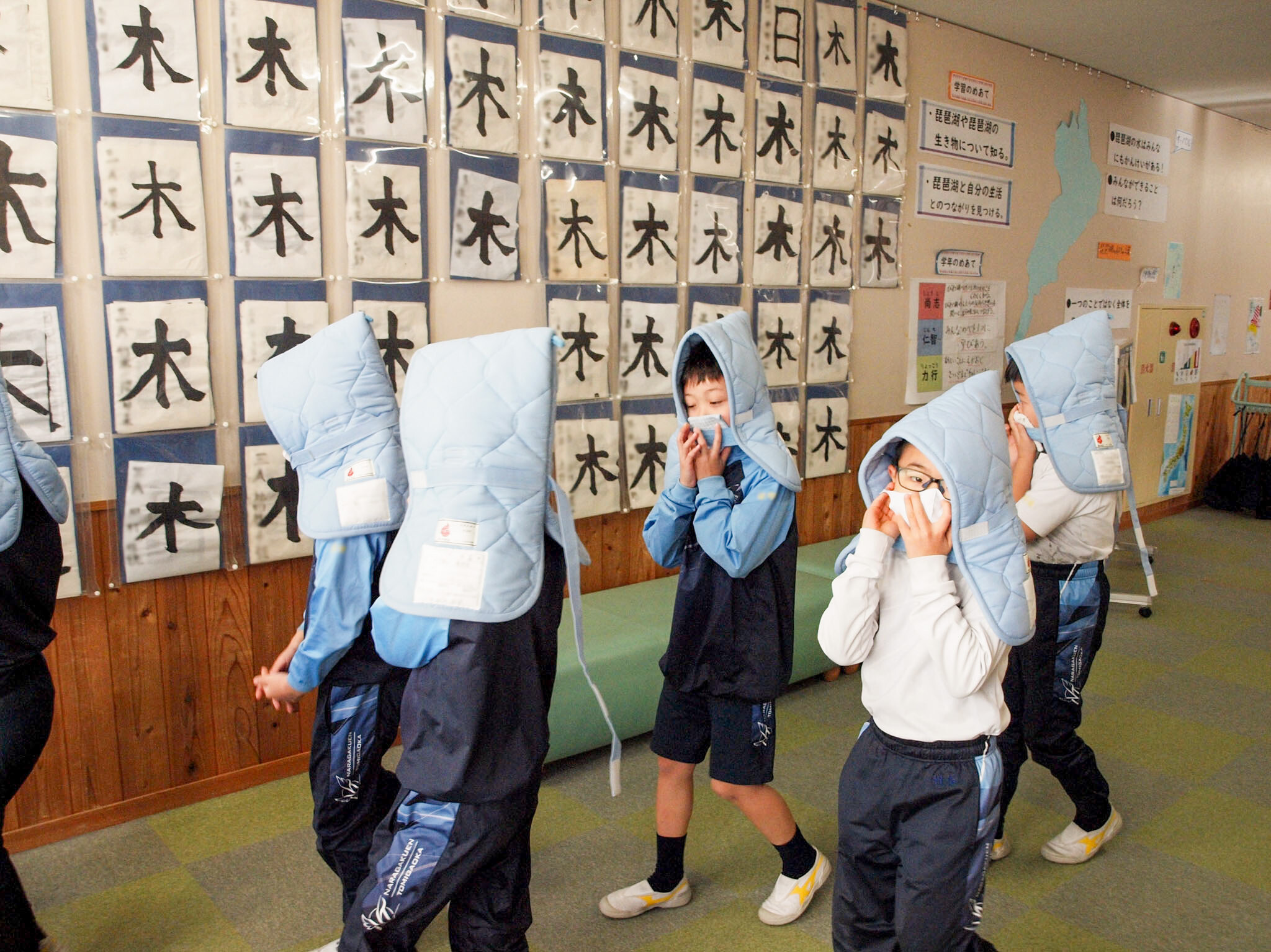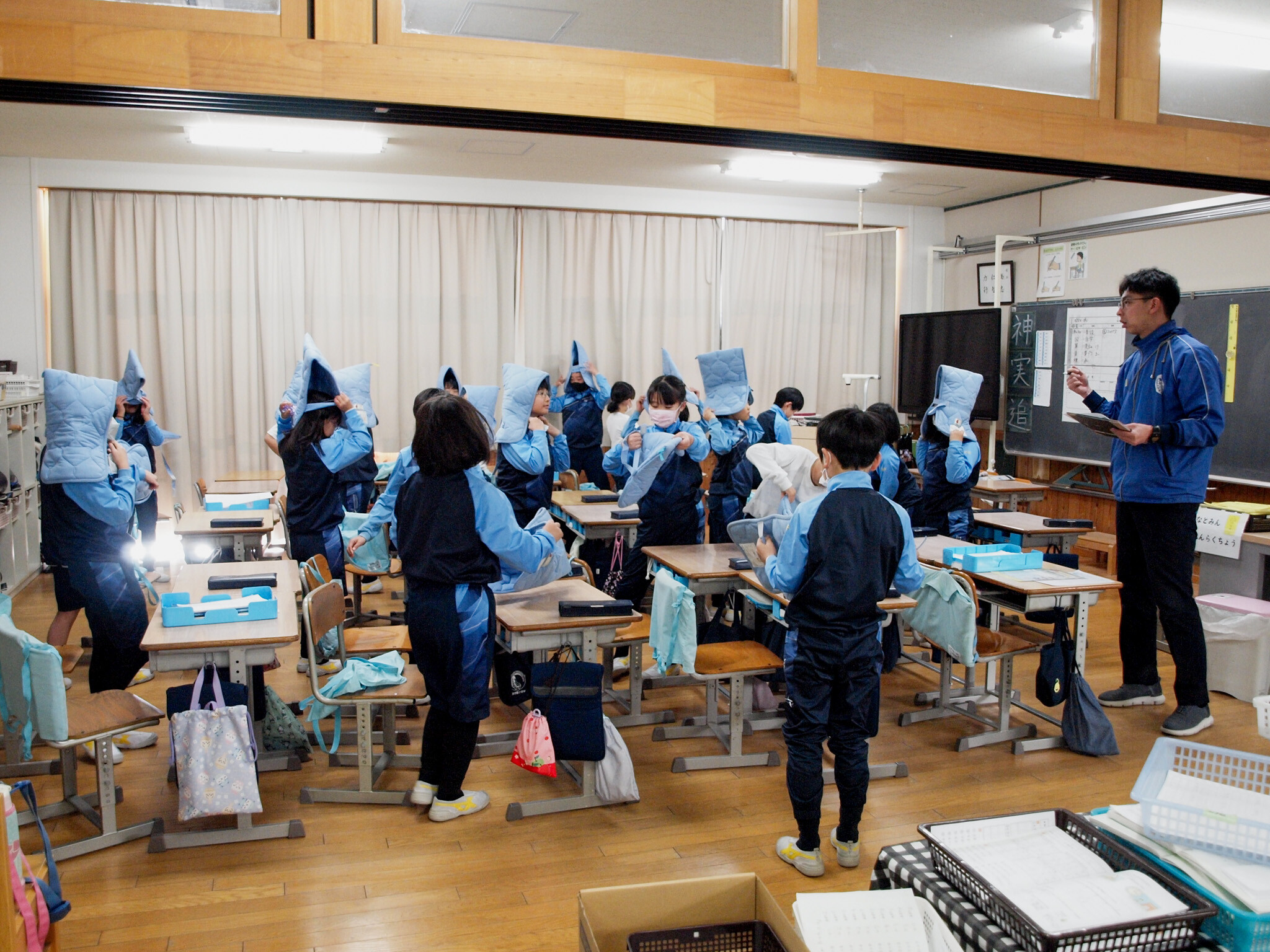 サイレン音とともに訓練用の校内放送が流れると、児童たちは速やかに机の下に身を潜め、頭を守りながら待機しました。その間、先生は教室内の安全確認を行いました。続いて先生の指示のもと、小学生は普段は座布団として使用している防災ずきんを着用し、各教室から避難場所へと移動しました。日常とは異なる緊張感の中、児童たちは真剣な表情で訓練に取り組んでいました。Pグラウンドへの避難完了までに要した時間は、3分11秒でした。