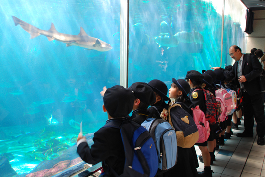 バスで水族園に到着後、クラス毎に館内を見学しました。探検ツアーでは普段見ることができない水槽の裏側を飼育員さんに案内していただき、飼育施設を見学しました。繁殖のための水槽や餌の調理場を回って飼育について勉強し、大水槽の裏では実際にサメに餌をやる体験もできました。質問コーナーでは「なぜいろんな生き物を同じ水槽で飼育するの?」「水槽はどうやって掃除するのですか」等、様々な疑問が飛び出し、子どもたちの興味は尽きない様子でした。