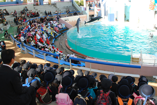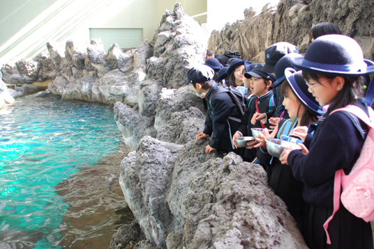 午前中はイルカのショーも観覧し、イルカ達のかわいいダンスや大ジャンプに子どもたちは大喜び。一番好きな海の生き物はイルカという子どもも多く、この日一番の思い出になったようです。 お昼にお弁当をいただいた広場では、タッチプールでヒトデに触ったり、大きな亀を間近で観察したりと生き物を身近に感じることができ、初めて触る生き物の感触に歓声があがりました。
