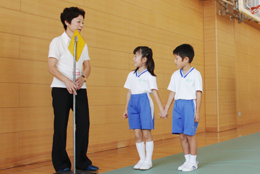その後、1年生は「交通ルール」のおさらいに、目と耳で安全を確認しながらの歩行練習を行いました。