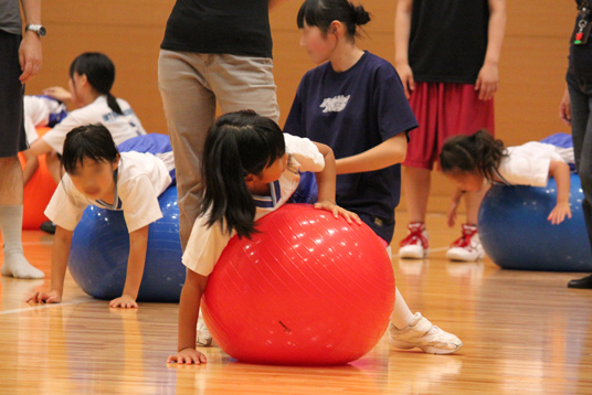 自己紹介をしたあとは手遊び「せっせっせ」で緊張をほぐしました。その後、動きをつけて「せっせっせ」をしたり、小さいボールや大きなボールを使い遊びました。児童と学生、児童と保護者、保護者と学生とペアを換えながら一緒に体を動かすことで、親子のふれあいの場、接することの少ないお姉さんとのふれあいの場、遊びを通して約束事(ルール)の大切さを学ぶ場となりました。最後に8個のバスッケトにボールを入れる遊びでは、なかなか入らない児童にみんなで声援を送るなど思いやりの姿が見えました。