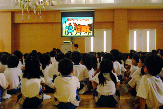 続いてプロジェクターに絵を映し出し、先生が七夕の伝説をお話ししてくれました。途中、牛の声に「わぁぁ!」と反応しつつ、織姫と彦星の物語を静かに聞いていました。