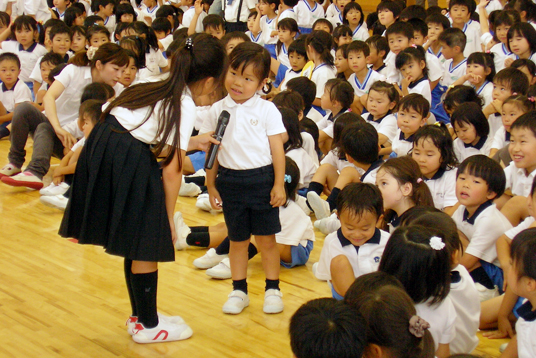 小学生が幼稚園児を招いて、七夕をお祝いする会を開きました。 体育館には願い事を書いた短冊が吊るされた笹が飾られ、3年生の司会でスタート。福永校長から「この会はみんなが主役です。みんなで頑張って、良い会にして楽しみましょう」と挨拶がありました。