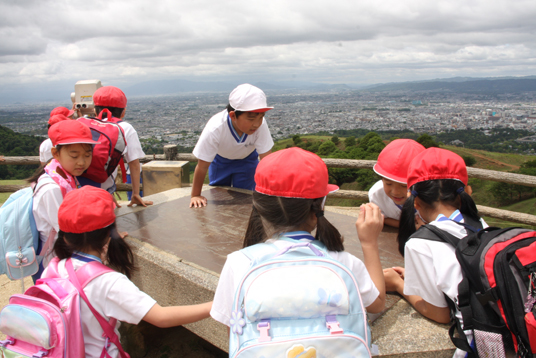 山頂からは、市街や生駒山、遠くには葛城・金剛連山も一望。その素晴らしさに子どもたちも、疲れを忘れて大はしゃぎでした。