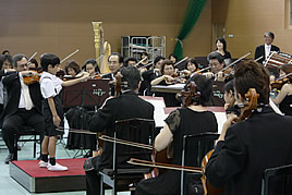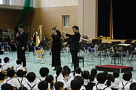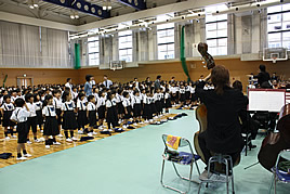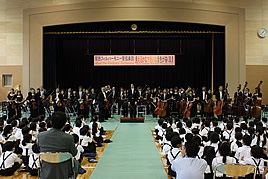 関西フィルハーモニーによるオーケストラ公演を行いました。 この公演は、文化庁の「平成21年度本物の舞台芸術体験事業」により実現したもので、体育館中に壮大なオーケストラが響き渡りました。