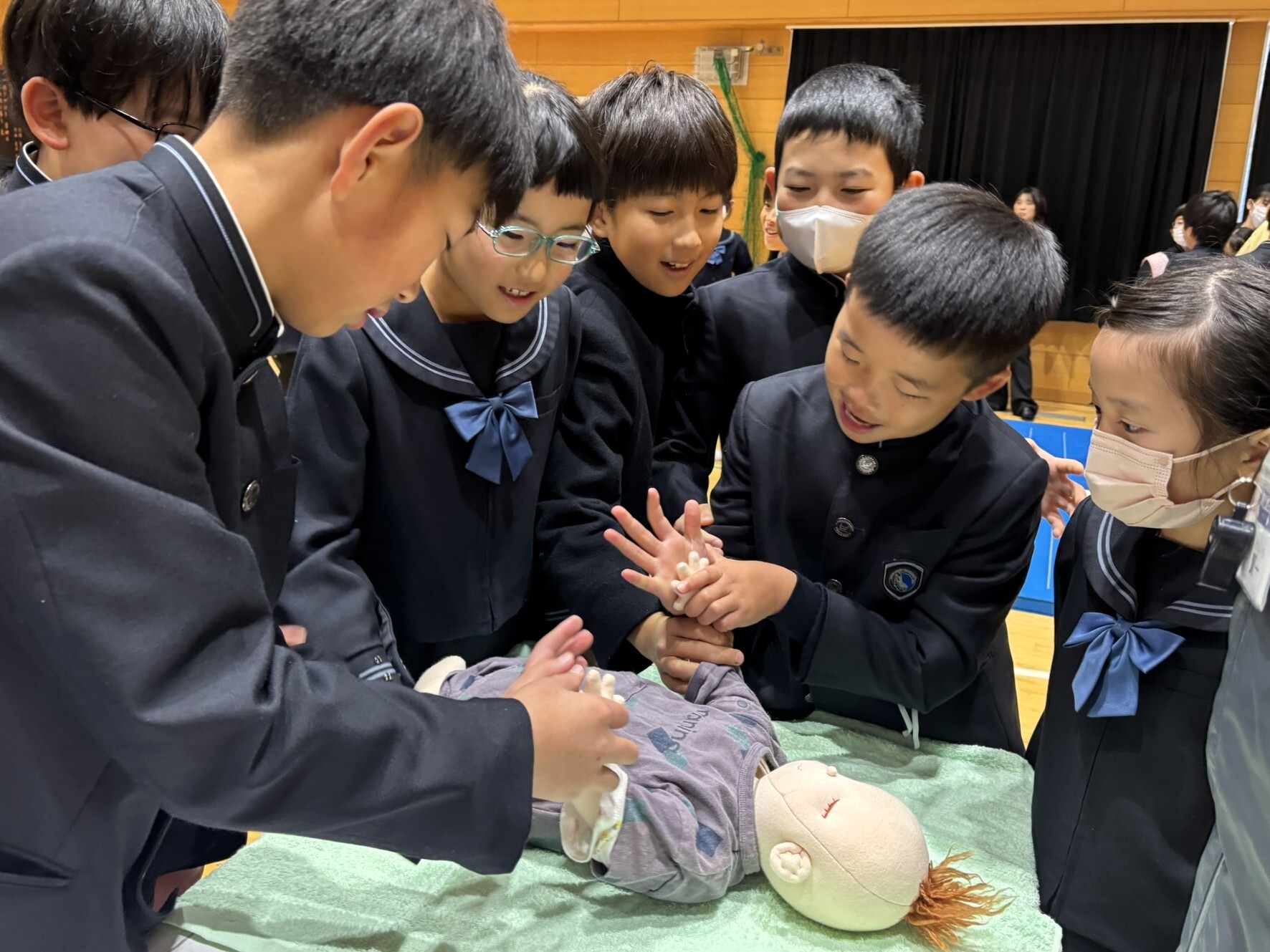 前半は、いのちの誕生や体の成長、プライベートゾーンの大切さについてのお話を聞き、後半は体験活動に取り組みました。聴診器で心音を聴いたり、妊婦体験でおなかに重りをつけて動いてみたり、約3㎏の赤ちゃん人形を抱っこしたりする中で、子どもたちは命の重みや尊さをより身近に感じている様子でした。