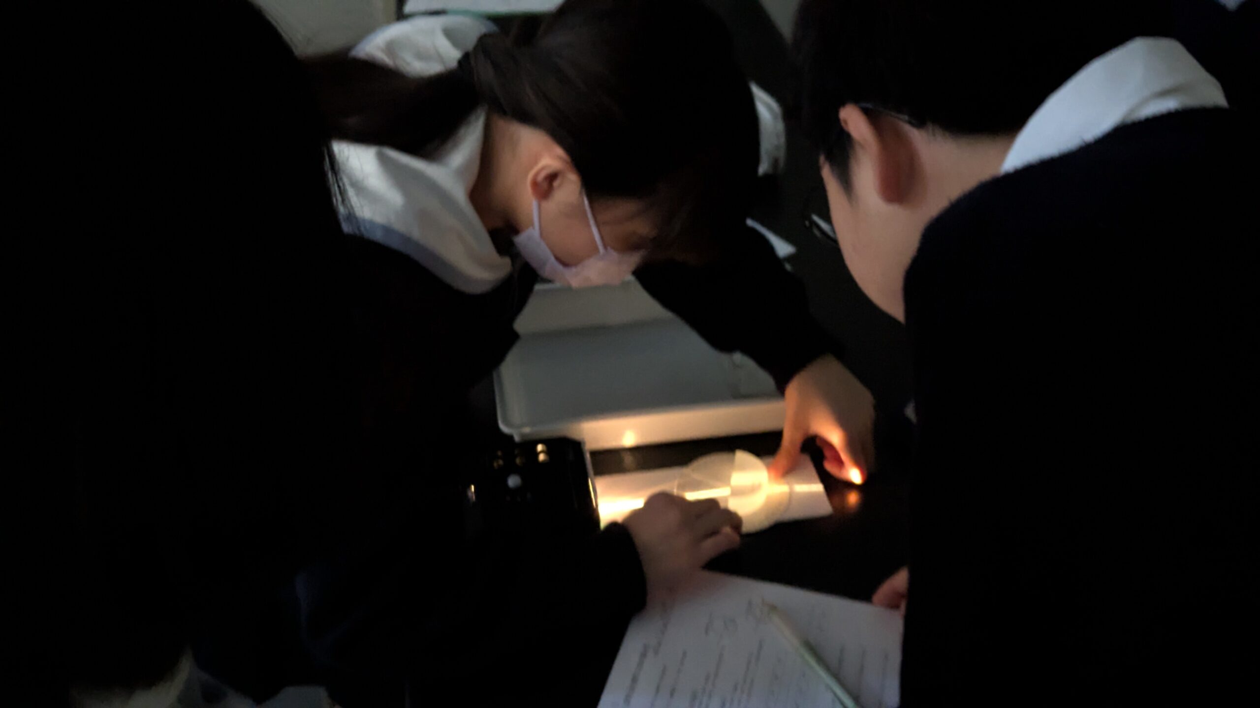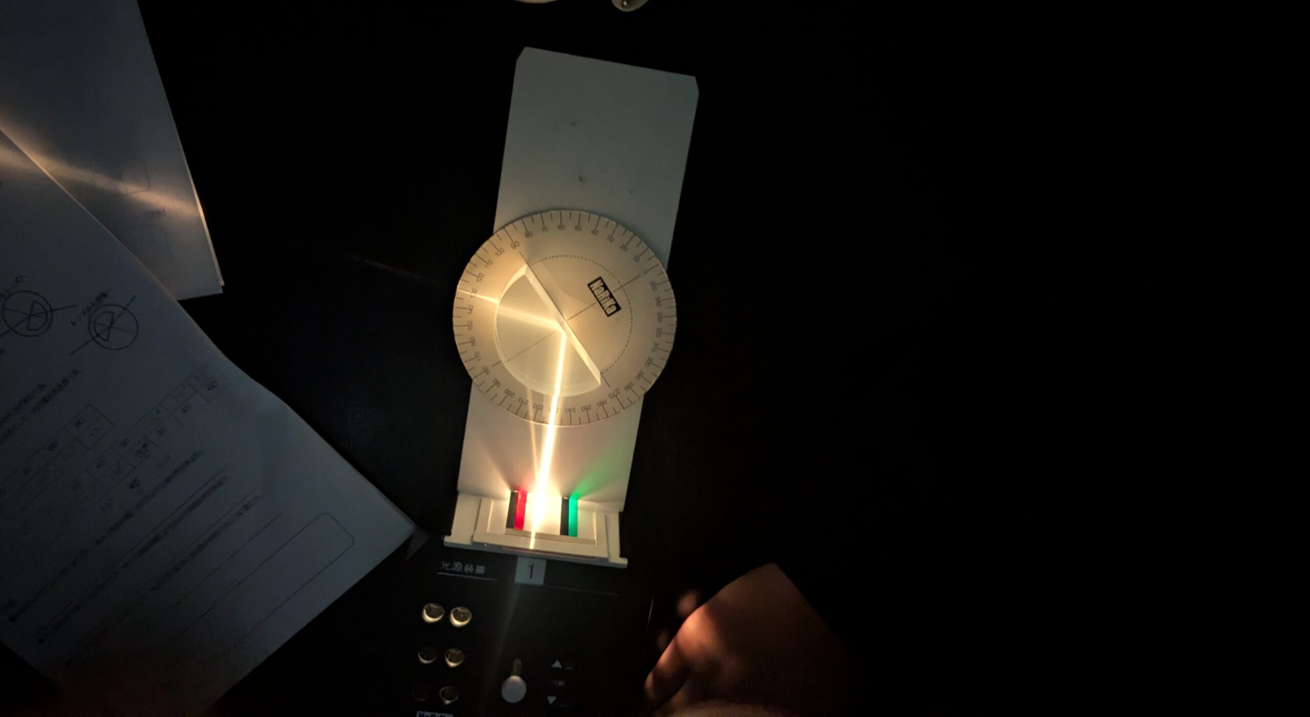 M3では光の進み方の実験が行われました。まず分度器に鏡を垂直に固定し、光をあてる角度を変えて、はね返った光の角度を読み取りました。次に半円型レンズを使って、光を空気中からレンズ中へと進めるときと光をレンズから空気中へと進めるときに分けて、光が入る角度を少しずつ大きくしながら、それぞれの場合の光が進む角度の大きさを比べました。そこにどのような規則性があるか考察し、プリントにまとめました。