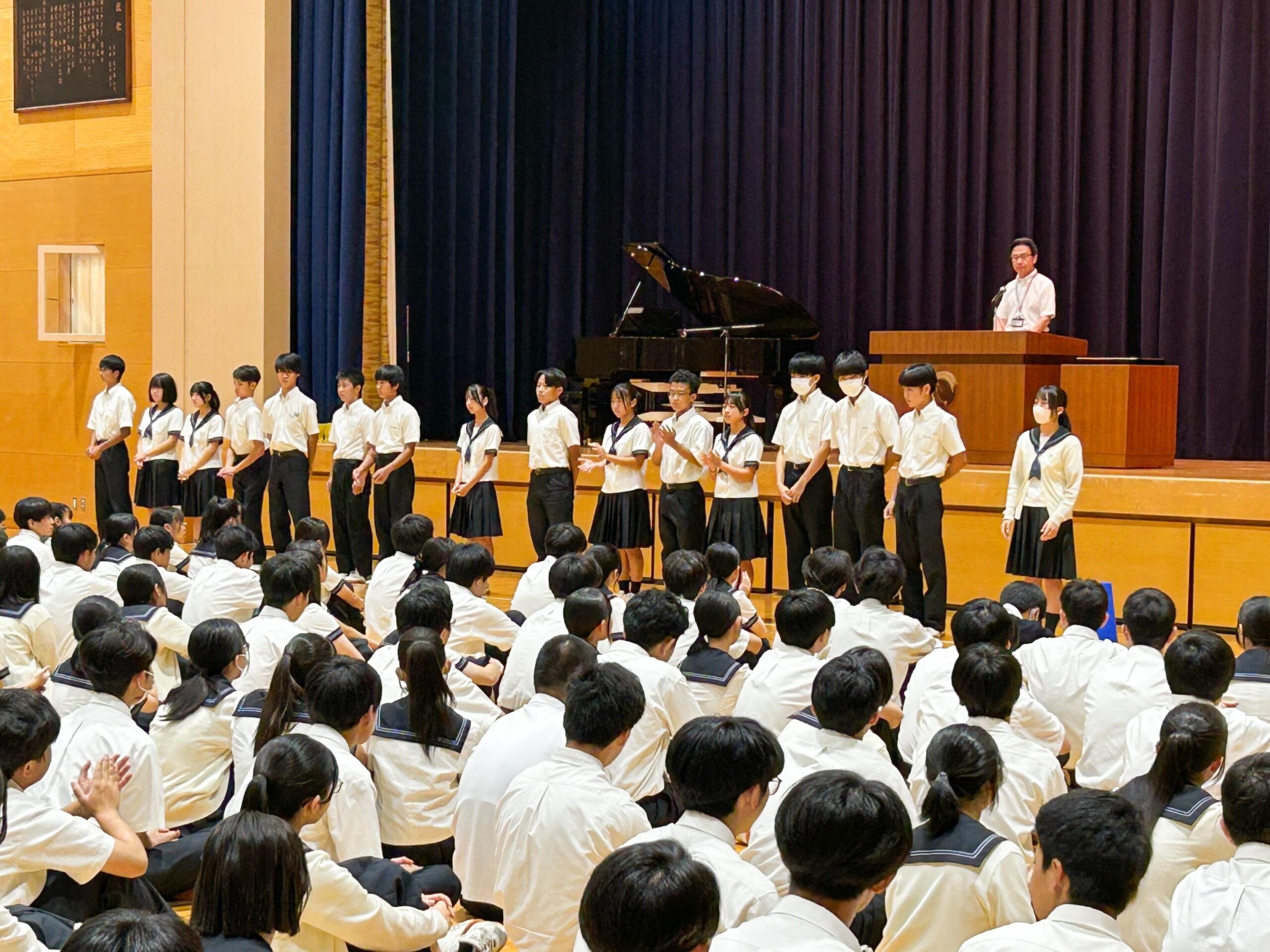 式辞では、1学期を振り返り、学習に部活動にまた宿泊学習などの学校行事にそれぞれがよく頑張ったことを褒め、人は生まれながらにして『自分で学ぶ力』と、ストレスに対するレジリエンスを高める力を持っていること、その力を使わずに過ごしてしまうことはもったいないことだと話しました。また、夏休みは特に朝起きと睡眠を大切に過ごし、Y4(高3)生には「夏を制する者は受験を制する」、この”夏休まず”は苦手科目の克服にも努めてほしいと伝えました。