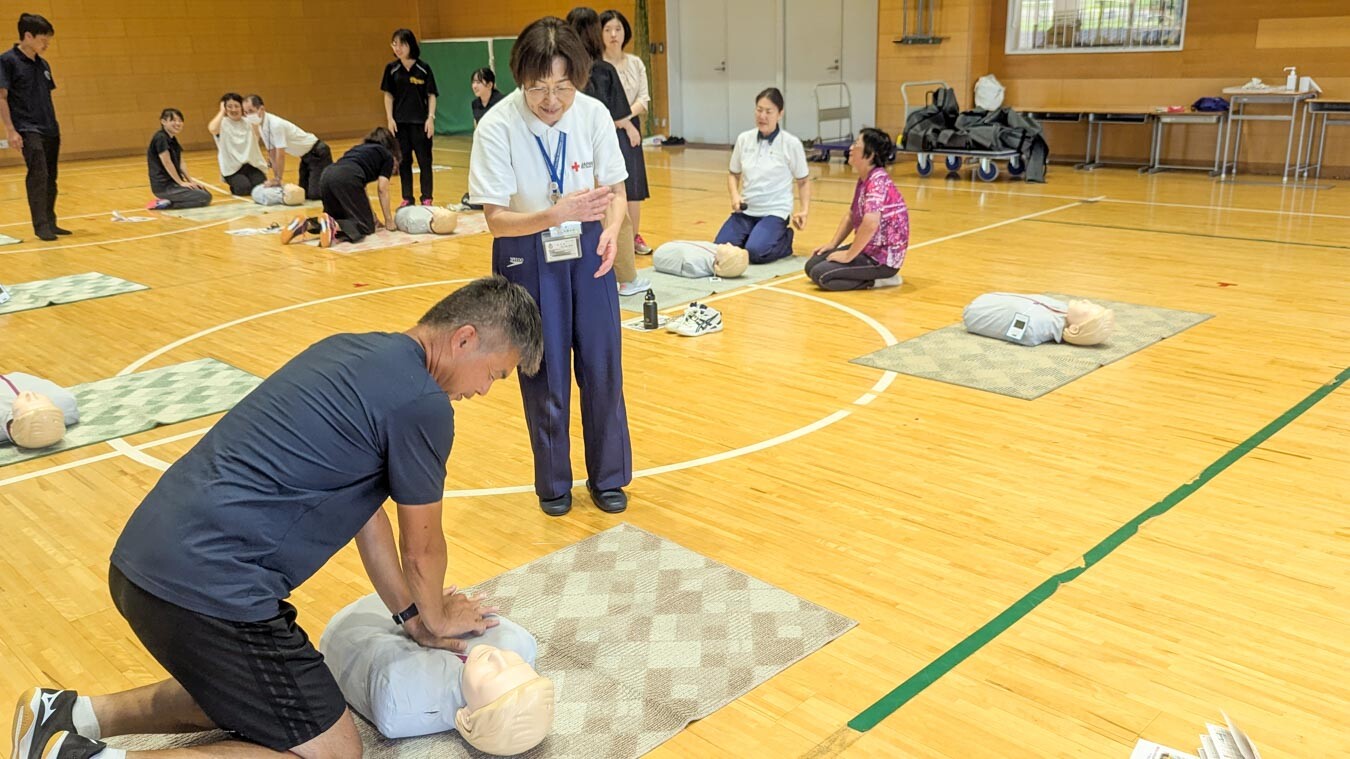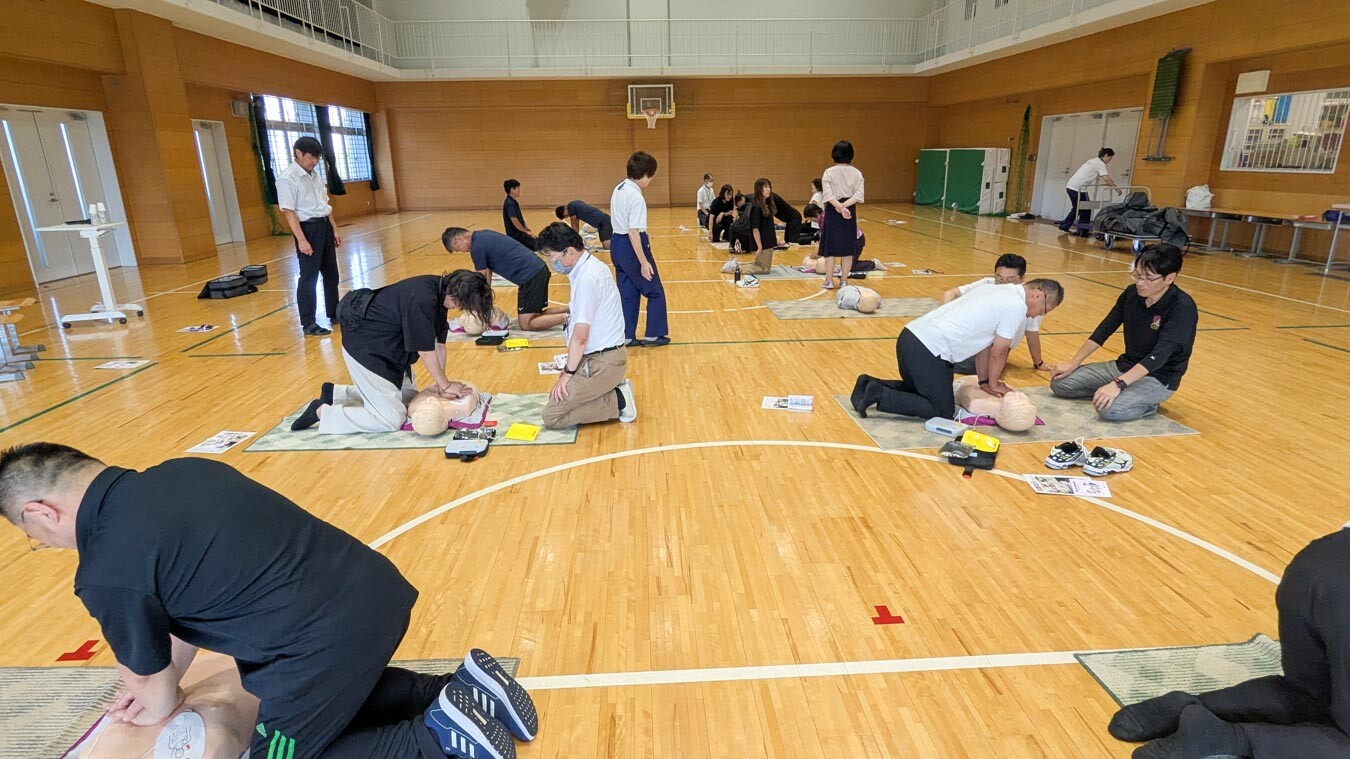 傷病者が発生したらまず助けを呼ぶ、反応の確認、呼吸の確認、胸骨圧迫「強く、速く、絶え間なく」、AEDの使用と胸部圧迫の継続と細かく指導を受けながら、皆、真剣に取り組みました。雨の中ではどう対応するのか、出血がある場合はどうか、などの質問にもお答えいただき、万が一の時に直ちに対応できるようにするためには、毎年の研修が必要だと改めて実感しました。