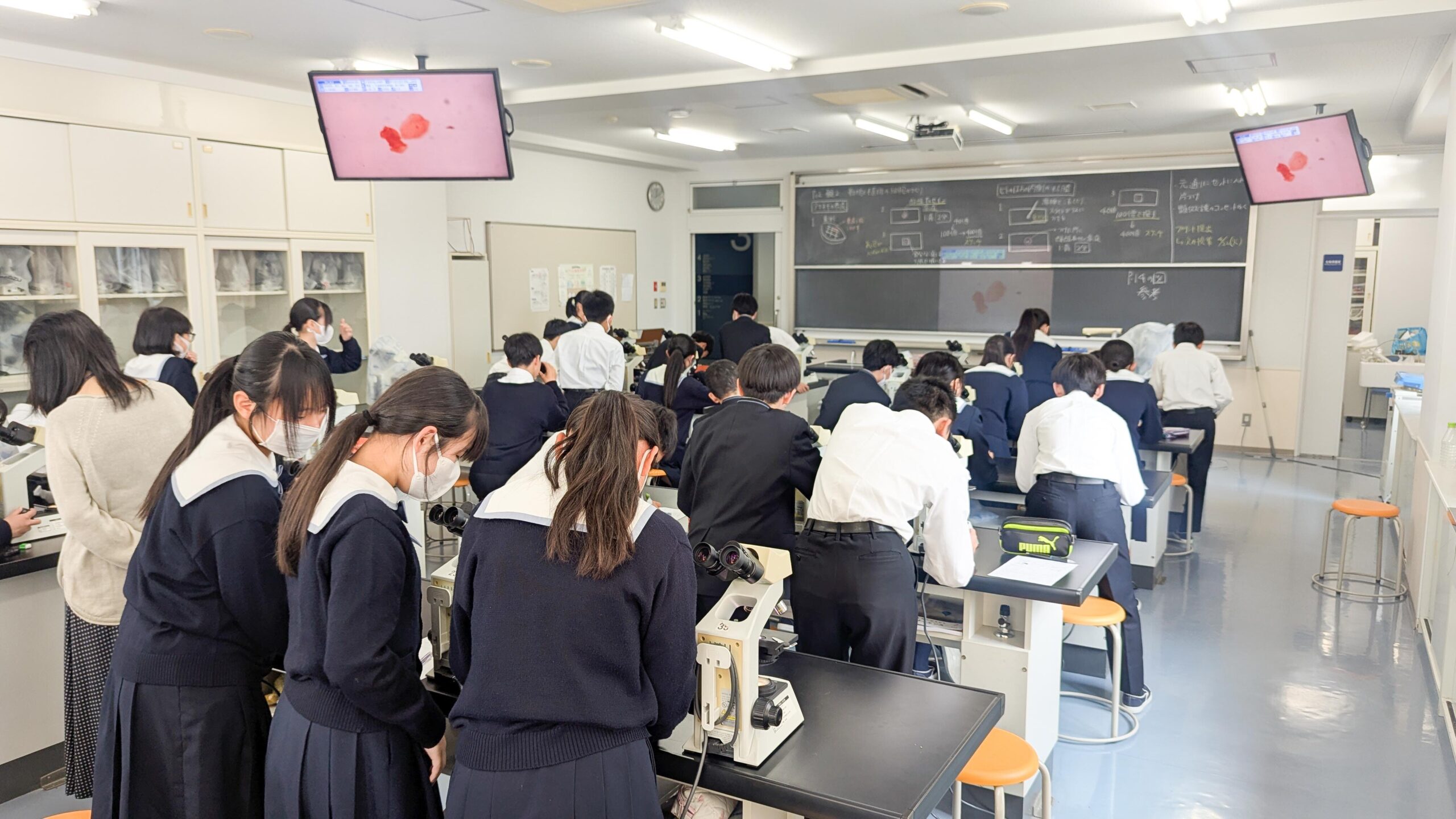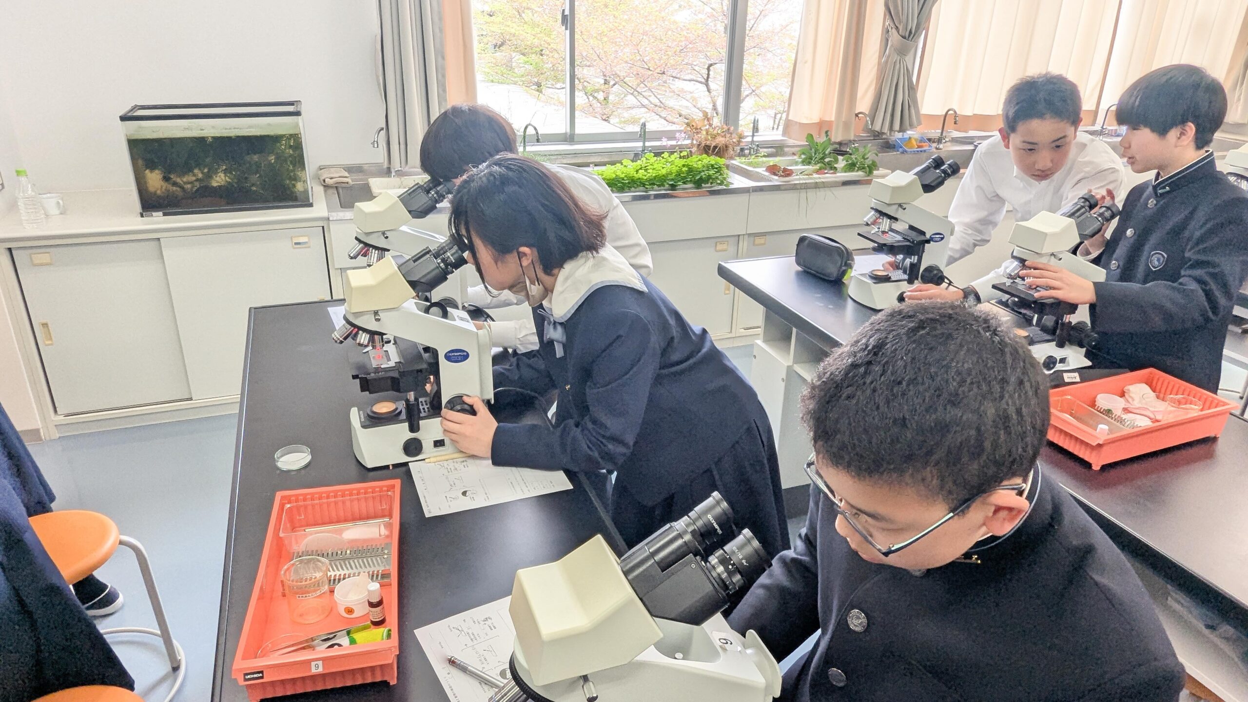 同じ日、M4(中2)では生物室で、動物と植物の細胞のつくりを観察する授業がありました。タマネギの表皮をはがしたものとヒトのほおの内側の粘膜を綿棒でとったものを酢酸オルセイン溶液で染色し、一人一台の光学顕微鏡で観察し、それぞれの細胞の違いや核の様子をスケッチしました。早速、核を発見した生徒や、なかなか見つけられず苦労している生徒など様々でしたが、友達の助けも借りながら、みんな真剣に取り組んでいました。