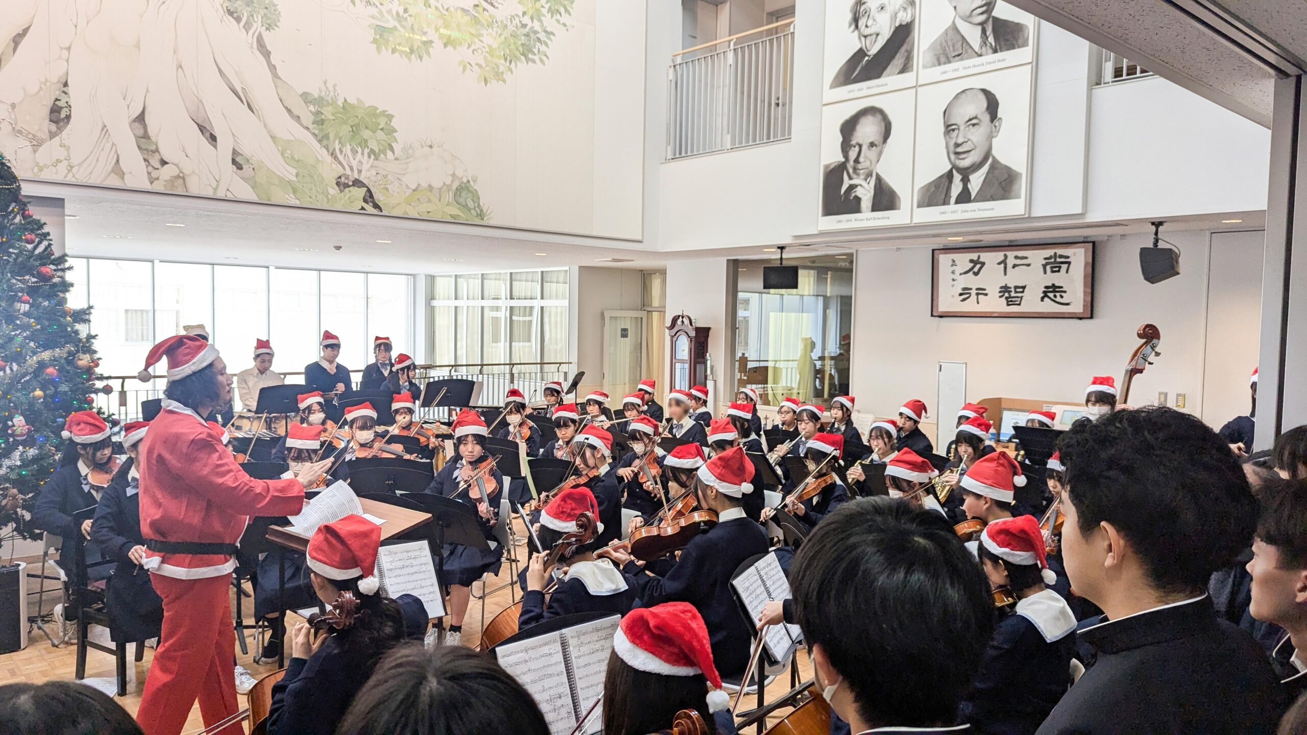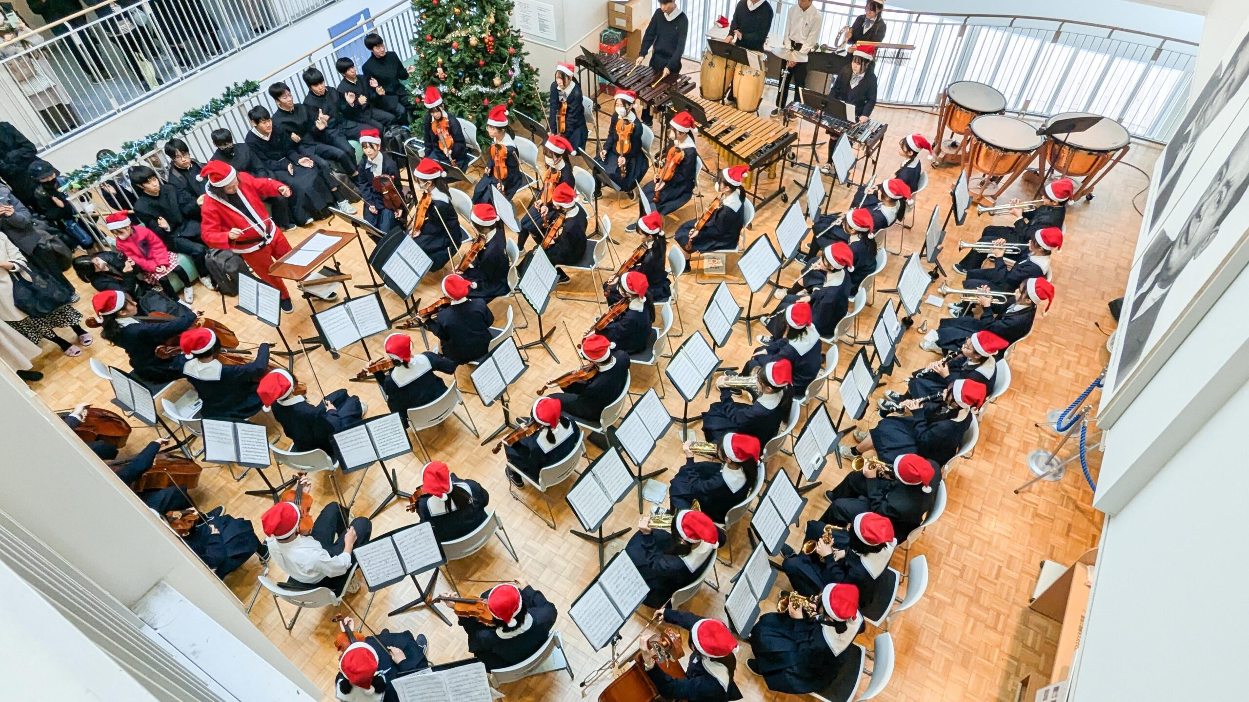 生徒会執行部中心に設置してくれたクリスマスツリーの下、サイエンスホールは4階まで満員となり、暖かい雰囲気で最後まで演奏を楽しんでもらえたのではないかと思います。
