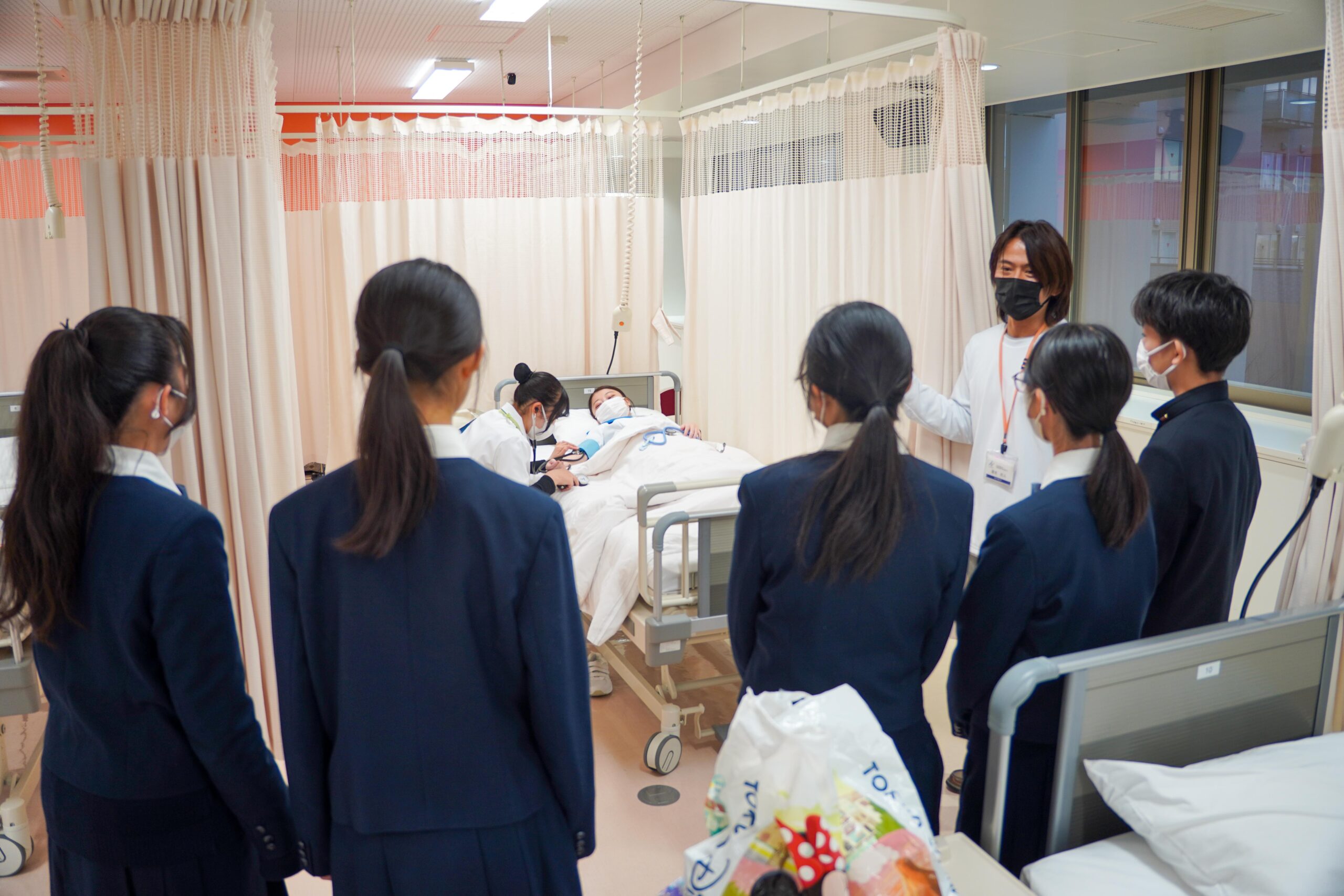 講義の後に実習室の見学をしました。病院実習を間近に控えた看護学生の方々が自主的に実習の練習をされていて、血圧を測る体験をさせていただき、洗髪の際に気をつけるべきことなどを実際に見せていただきながらお話を聴くことが出来ました。