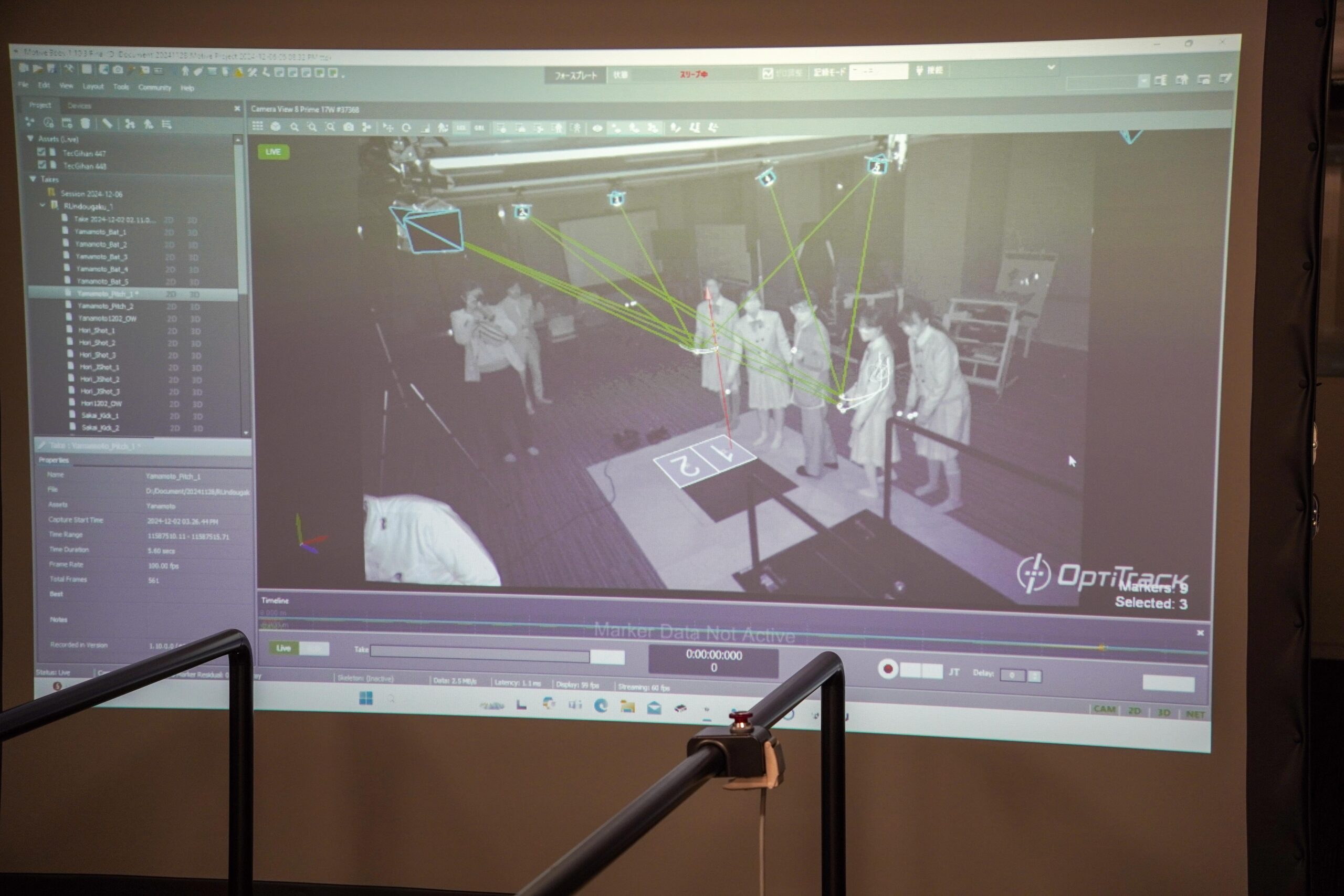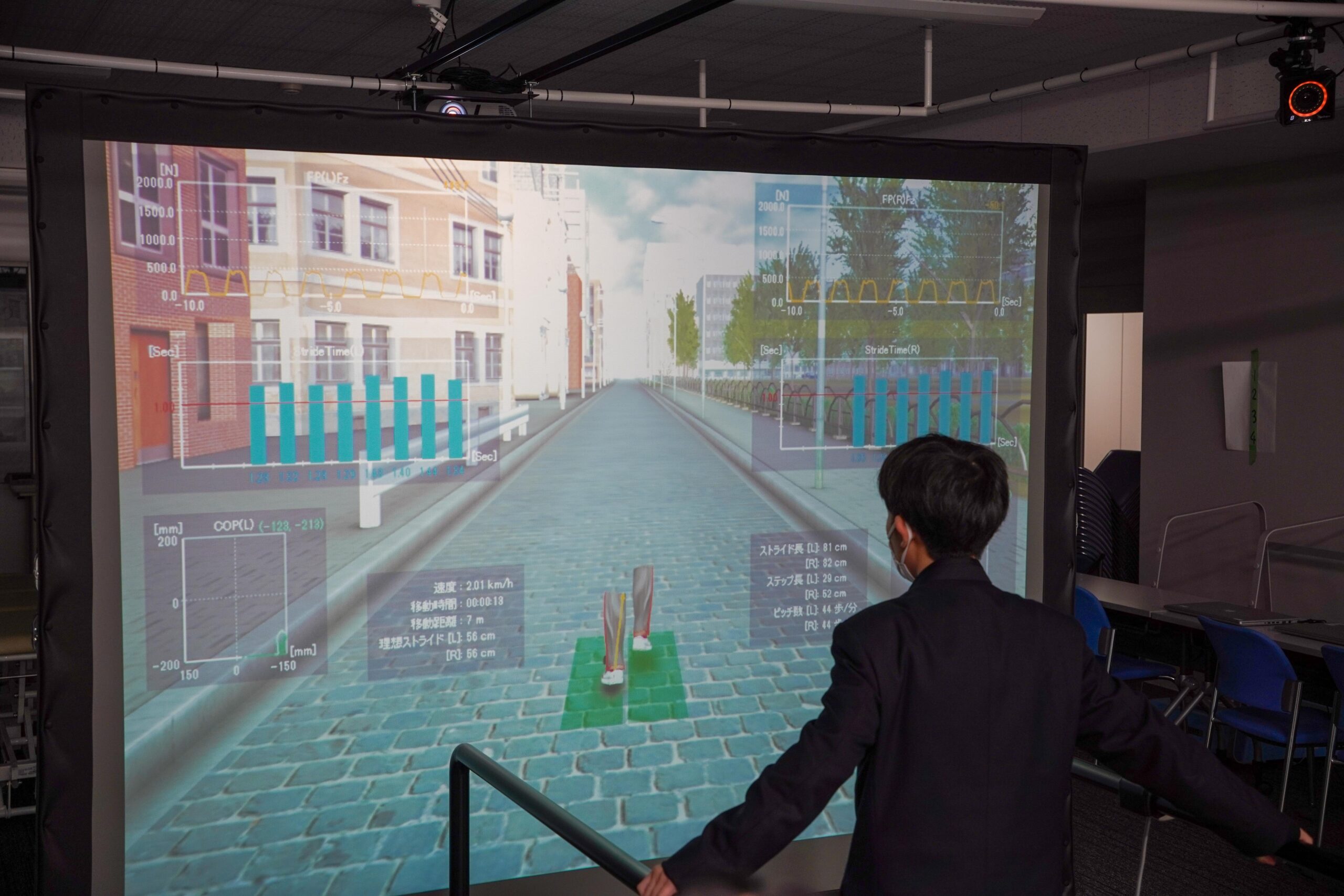 次にリハビリテーション学科の前田吉樹先生にお話を伺いました。モーションキャプチャー技術を用いて人間の動きをパソコンに取り込み、その動きを解析してリハビリテーション治療計画に活かすといったことを研究されています。医療現場でも医工連携が活発になっていますが、AIやVRなどを用いた技術の進歩によって、より先進的な医療ができるようになっていること、またそれを扱える技師を育てる必要があることなどを教えてくださいました。実際にモーションキャプチャーで自分達の動きを投影したり、バーチャルシステムを利用して仮想空間上でリハビリ活動を体験させていただいたりして、技術の進歩を感じました。