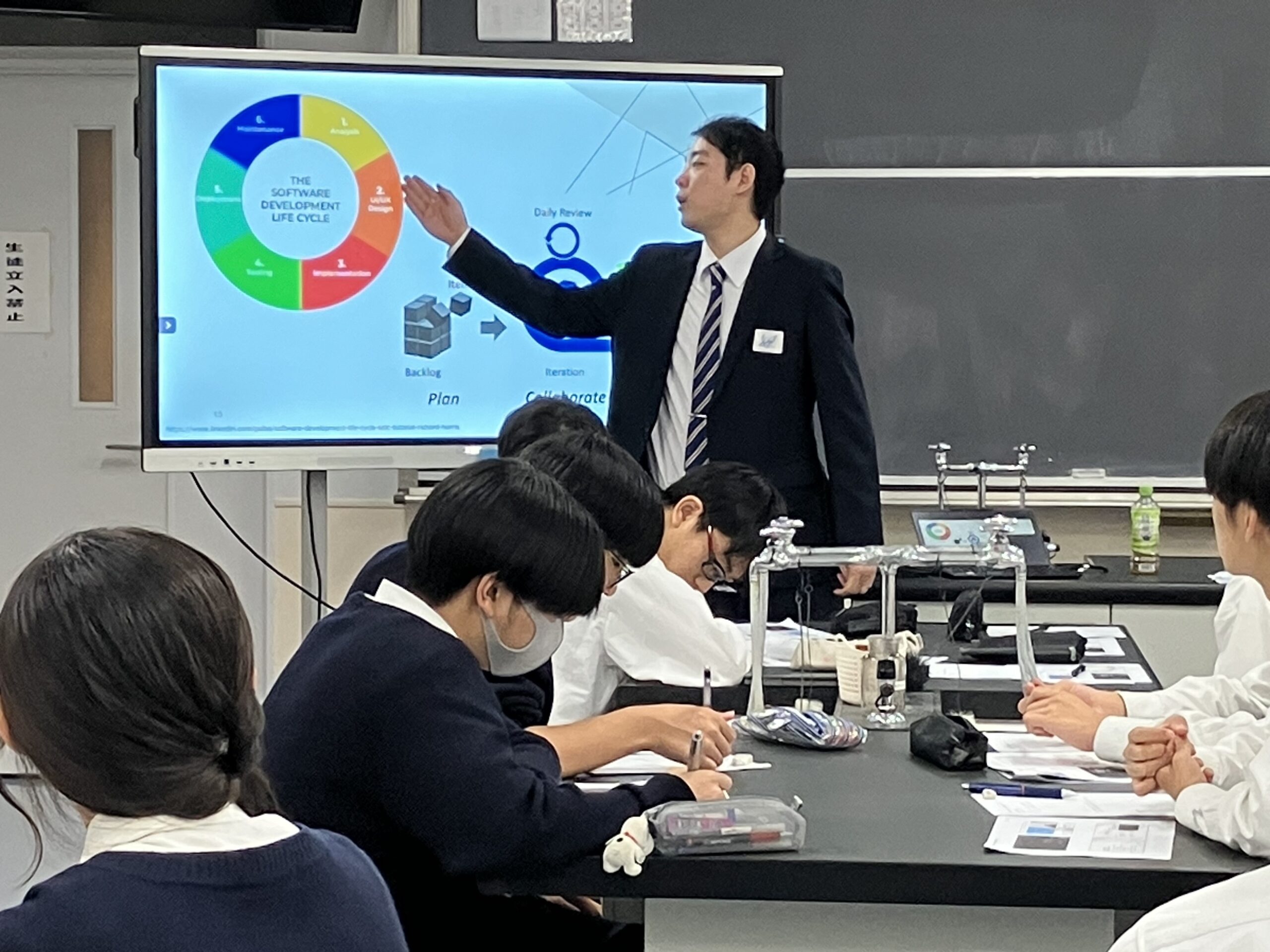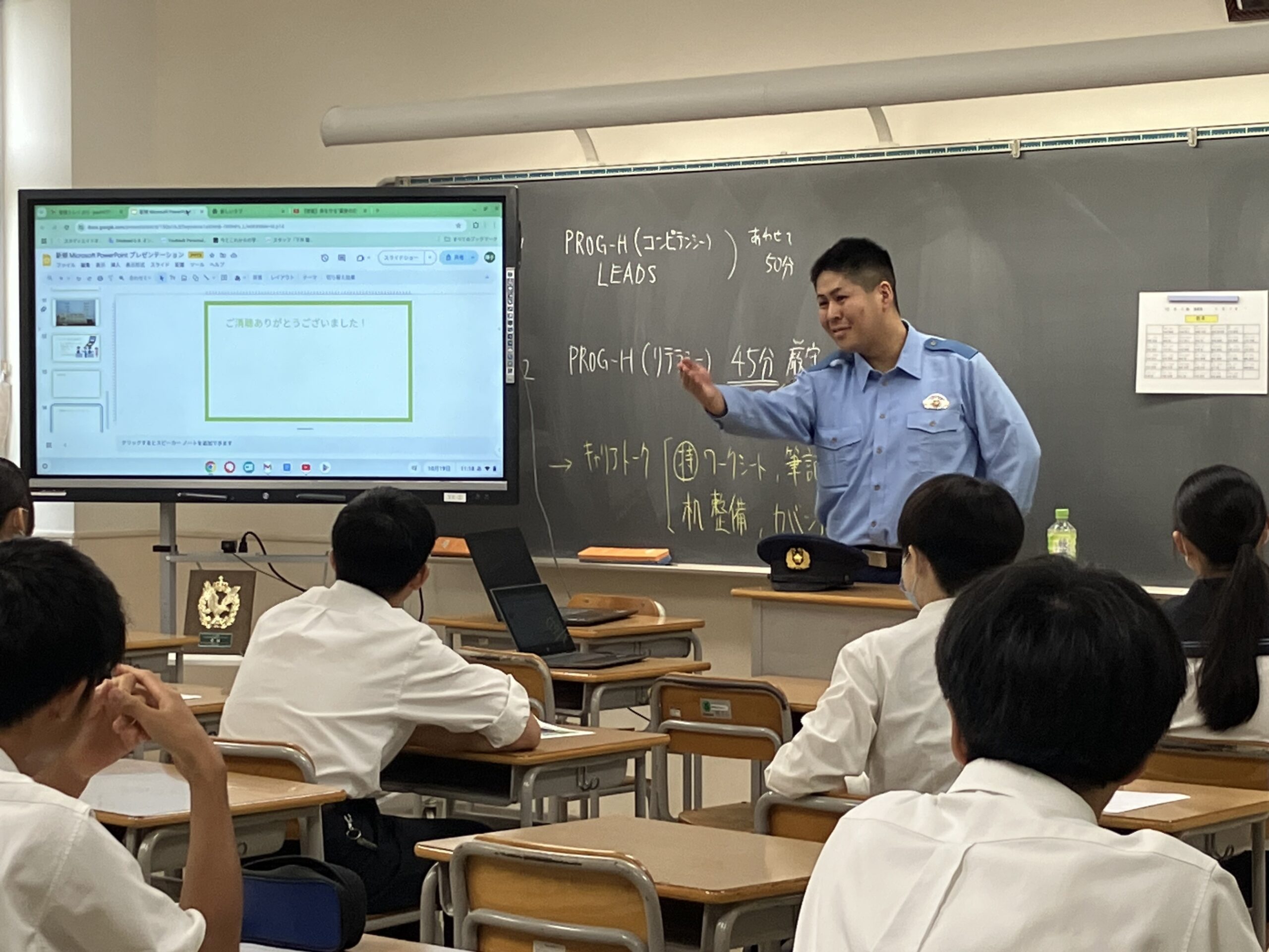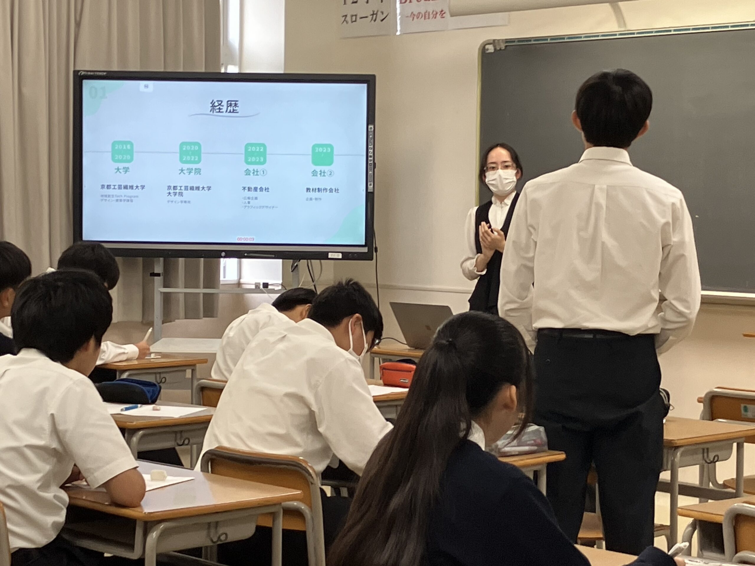 今年度は、経理、警察、銀行、制作企画、人材派遣営業、公務員、経理管理、システムエンジニア、建築士、研究職、医師、薬剤師と多種多様な分野で活躍されている卒業生の方々に来ていただきました。卒業生は、仕事の内容は勿論、その仕事を選んだ動機、厳しさややりがいについて熱く語ってくれました。生徒はそれぞれの興味のある仕事について熱心にメモをとりながら講義を受けていました。講義後の質問の時間では、積極的に手が上がり、社員の意見のまとめ方、営業における言葉の使い方、金融に関する専門的な内容まで多岐にわたって質疑応答がありました。中には定期考査の勉強の仕方についても質問する生徒もいました。