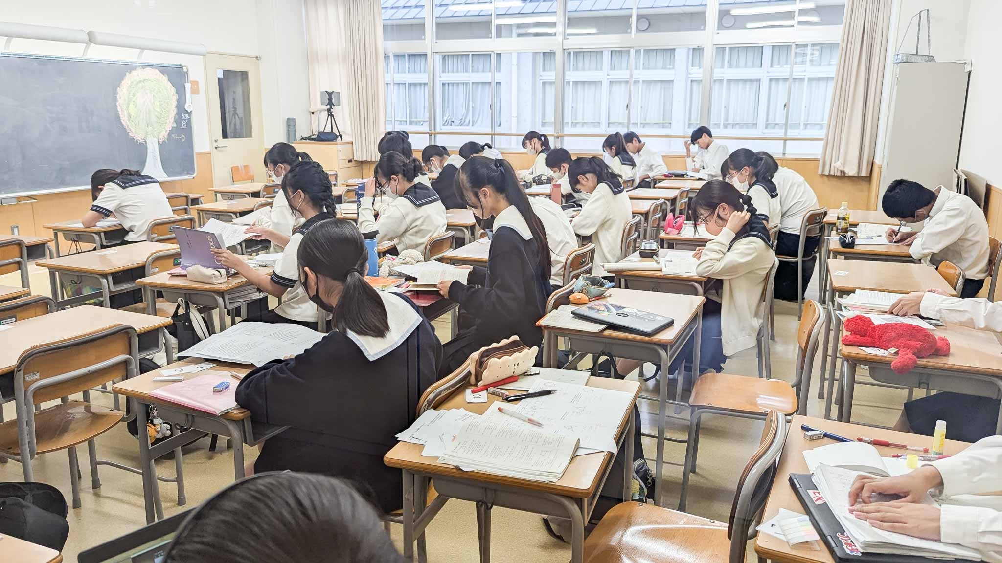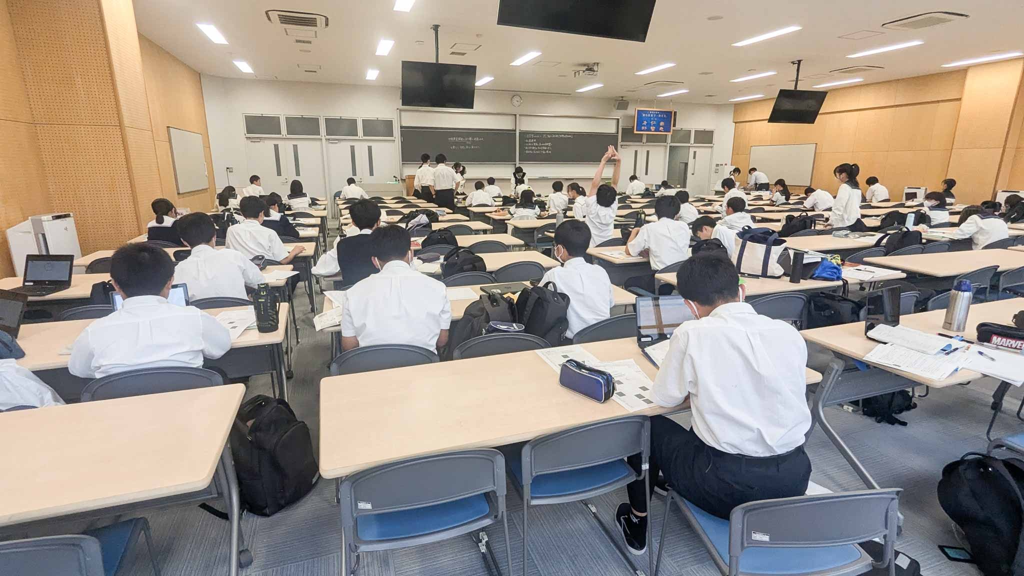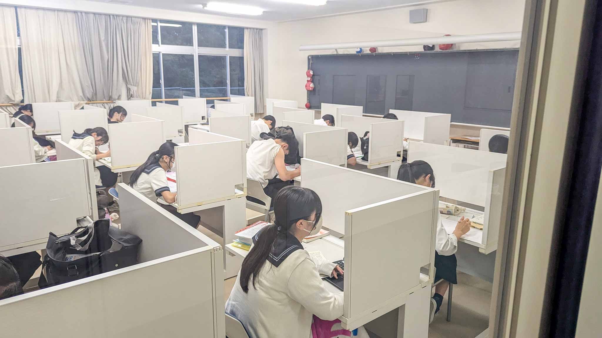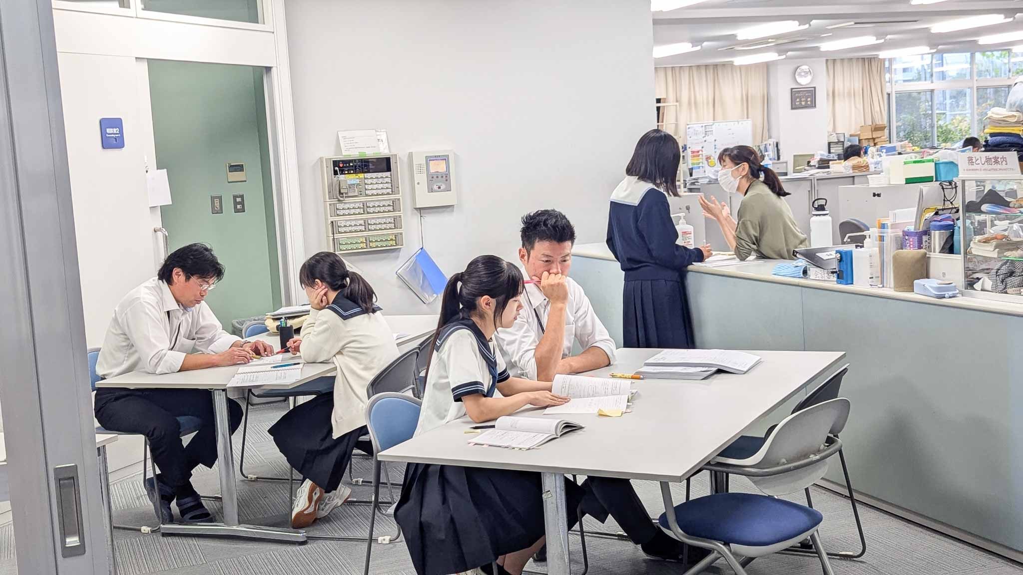 2学期中間考査まであと1週間。部活動も今日から停止となり、学校の自習室や大講義室などは試験勉強で残る生徒たちでにぎわっていました。職員室前では質問に訪れる生徒、サイエンスホールでお互いに教え合っている生徒など、学校全体が試験モード満載となっています。