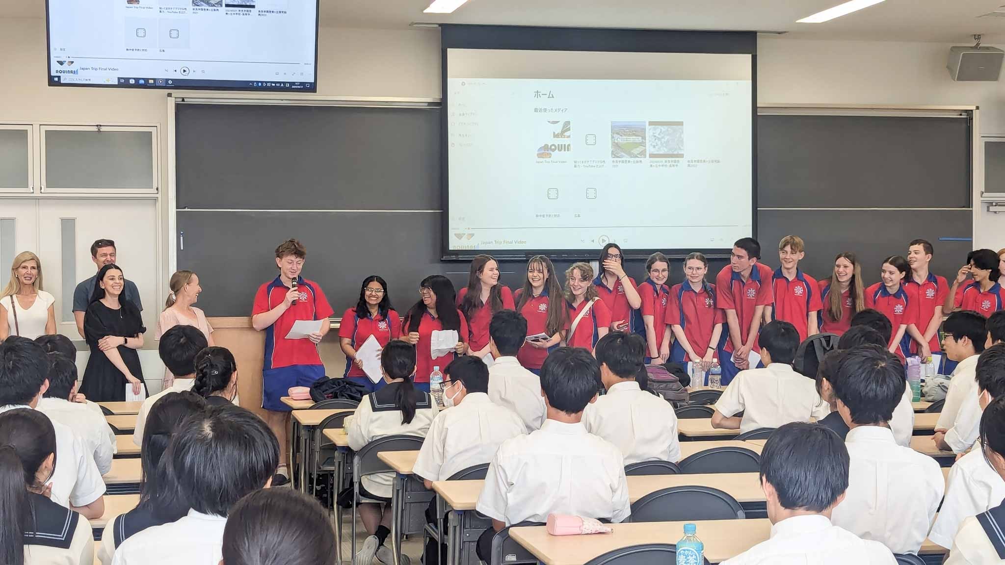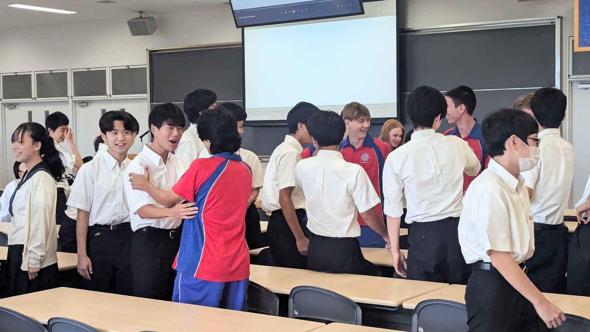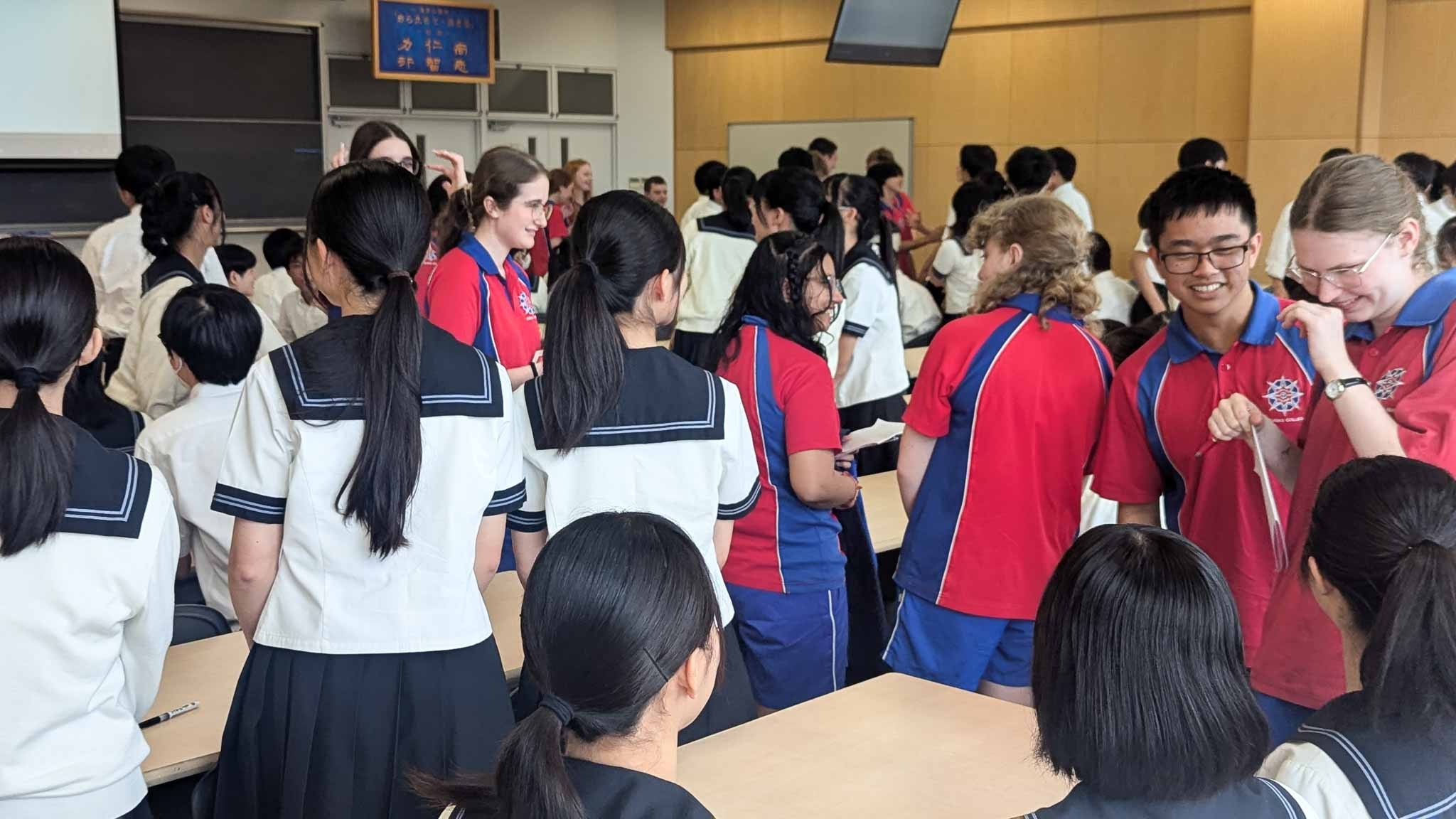 Welcome ceremonyでは校長のたどたどしい英語挨拶の後、代表生徒が流ちょうな英語で歓迎の言葉を述べてくれました。Aquinasの生徒たちは日本語を学んでおり、全員が日本語で自己紹介と趣味などを述べ、温かい拍手で場が和みました。交流会では生徒たちはすぐに打ち解け、会場内は笑い声や楽しい会話で盛り上がっていました。