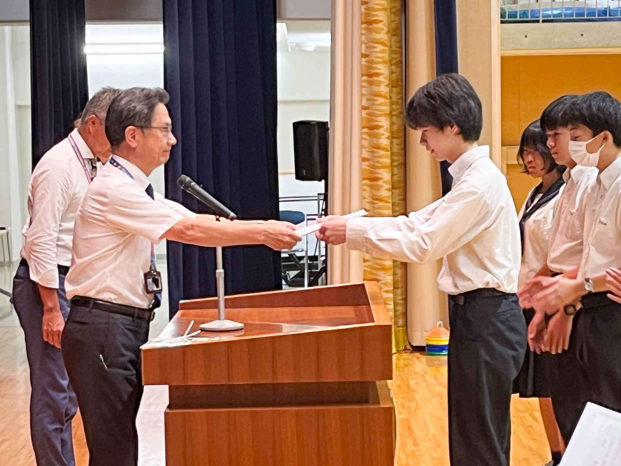 8月21日、夏休みが終わり、2学期がスタートしました。始業式に先立ち、夏休み中の試合等で受賞した賞状を伝達。内容は、サッカー部の奈良市高校選手権大会準優勝、室内楽部の全国高等学校総合文化祭器楽・管弦楽専門部会賞、競技かるた部の全国中学生選手権大会団体戦第3位、交通研究部の全国高校鉄道模型コンテスト モジュール部門理事長特別賞・ベストライター賞、テニス部は近畿高校テニス大会県予選女子ダブルス第2位でした。