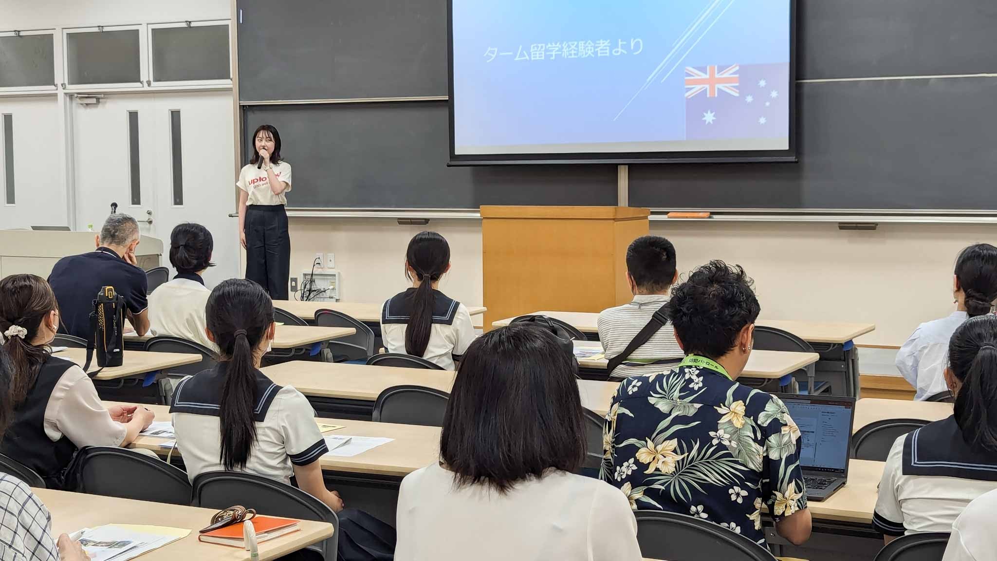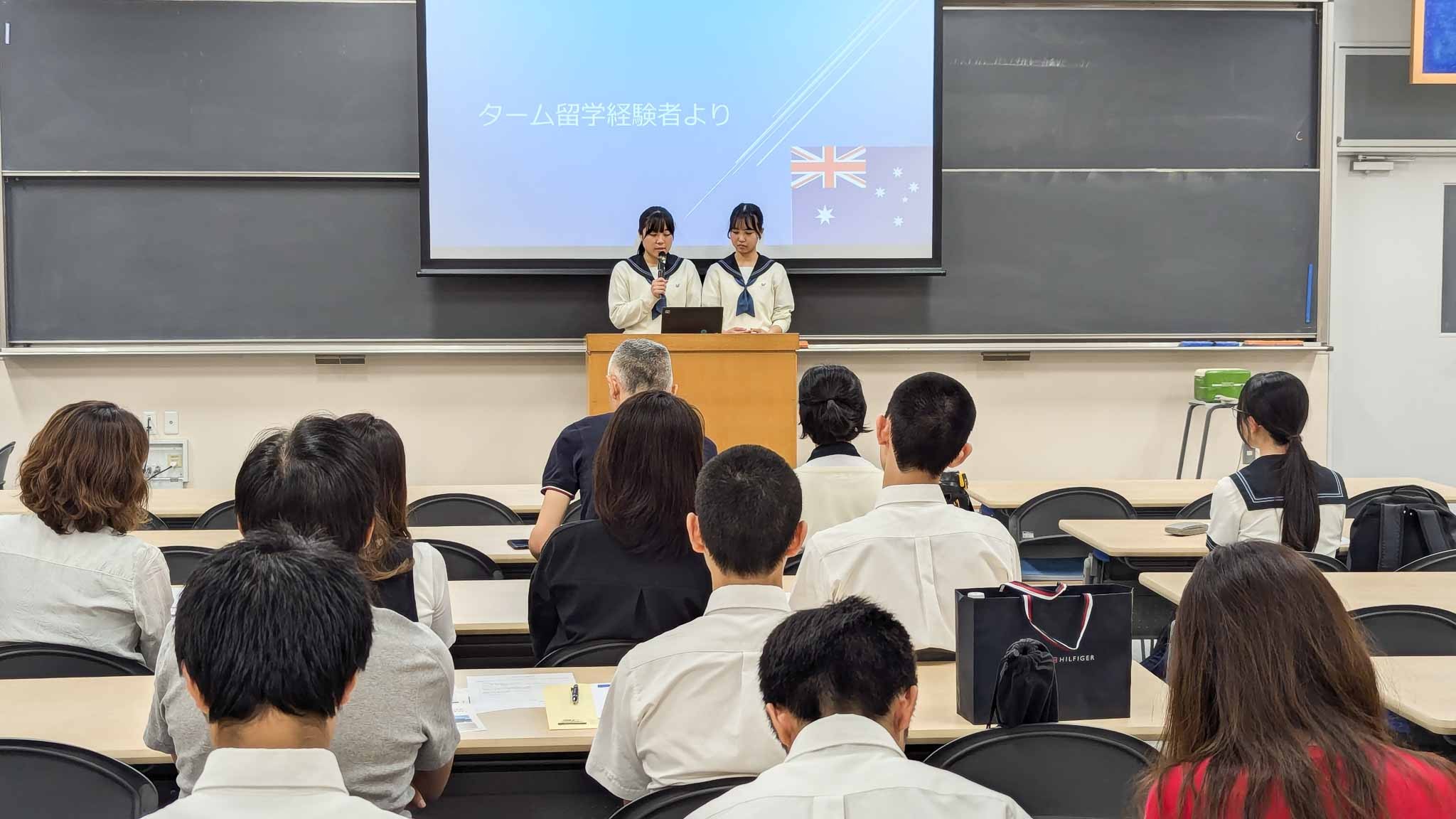 また今回は、6年前に第1回ターム留学に参加した大学4年の先輩や今年のターム留学を経験し、学年のオーストラリア語学研修にも参加した2名のY3(高2)生からも留学の体験談を話していただきました。
