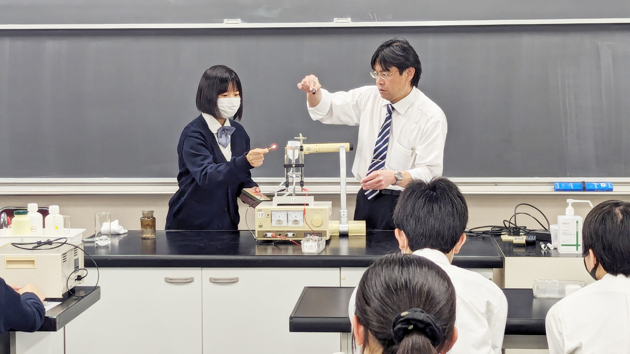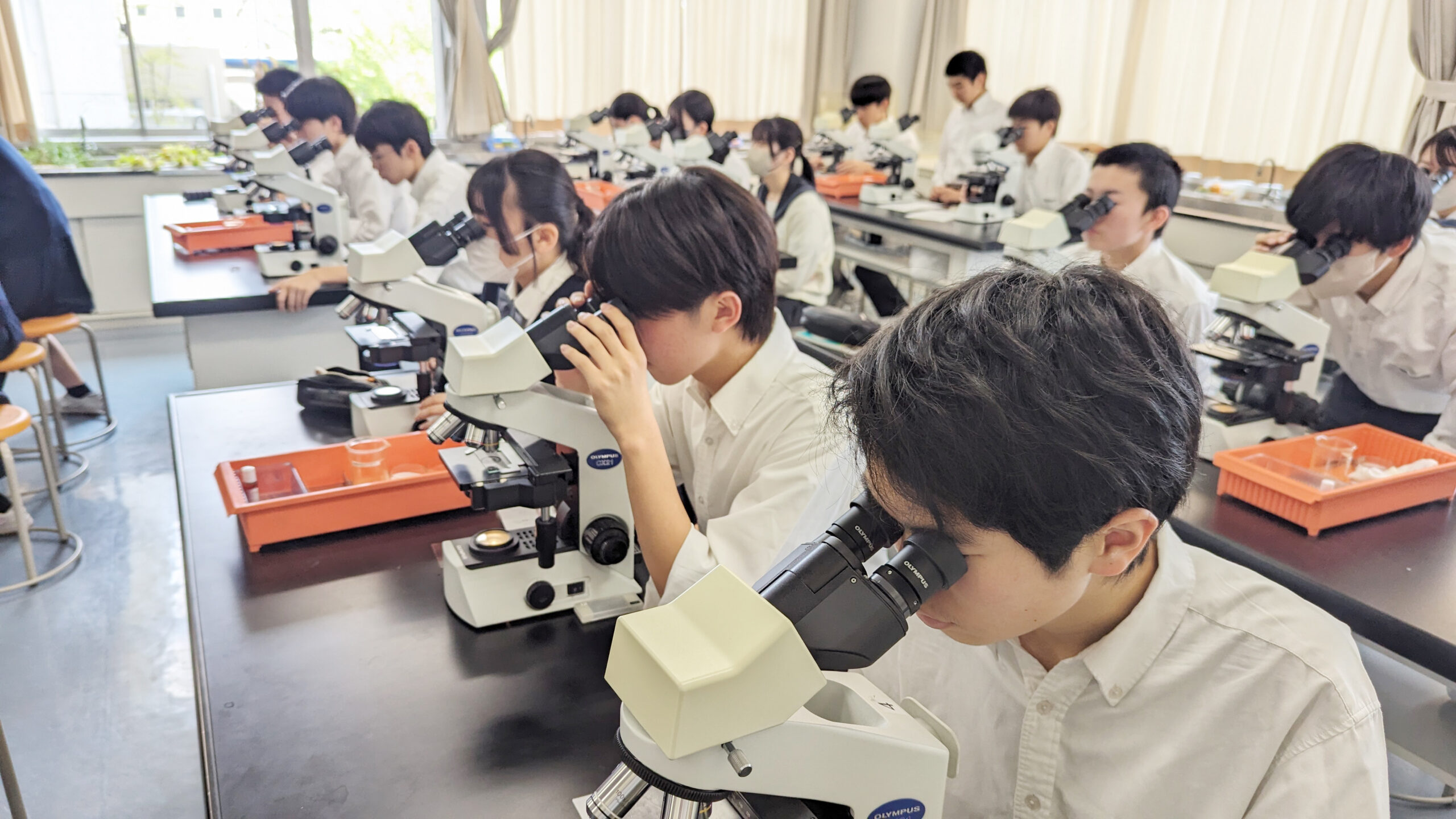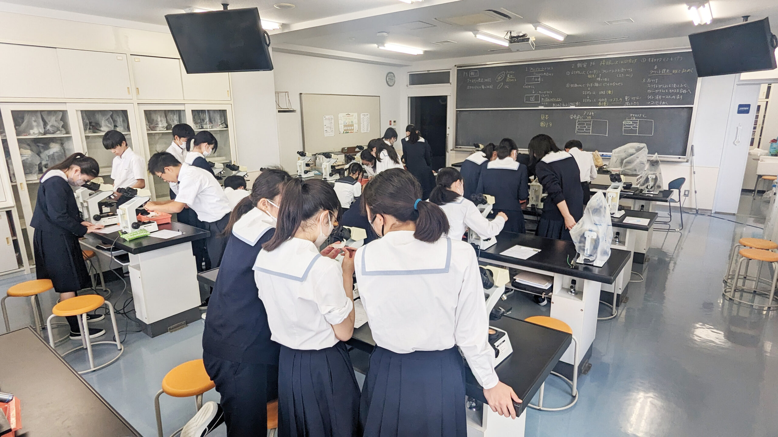 本校は化学実験室が2教室と生物・物理・地学実験室があり、様々な実験授業を展開しています。実験により生徒の興味を喚起するとともに科学的に物事を見る力を培ってまいります。