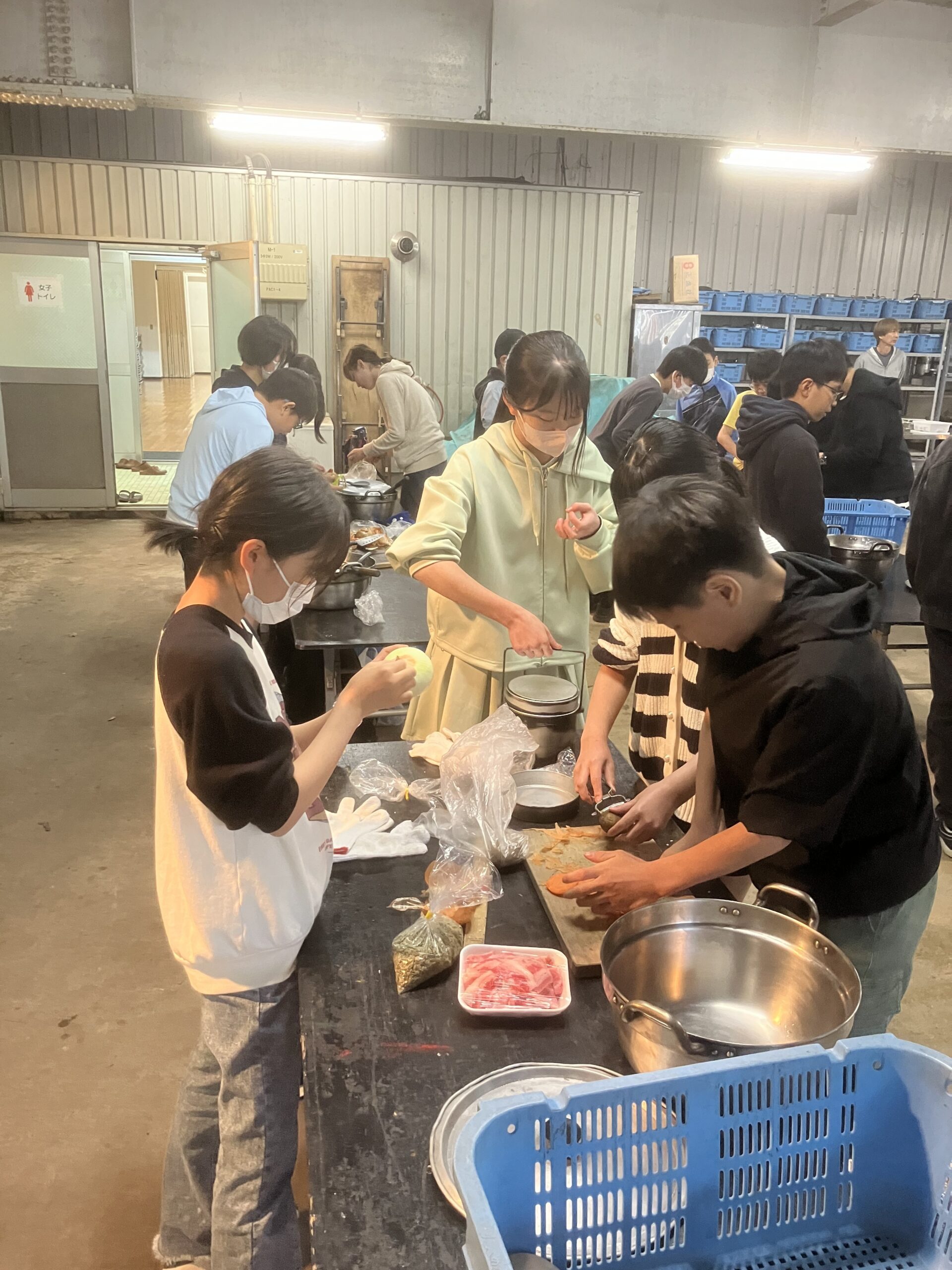 2日目の午前中に、各クラスでグループごとに結果を発表し、クラス全員で審査しました。その後は、飯盒炊飯とカレー作りです。各グループ全員で協力して、米を洗うもの、野菜を料理するもの、薪に火をつけるものと分担し、最後は、出来具合を確認して皆でおいしくいただきました。あいにくの雨でしたが、野外で食べるカレーは最高でした。午後は、プロジェクトアドベンチャーを実施しました。屋内4か所にクラスごとに分かれてクラスの親睦を図り、一緒に問題解決型のゲームに取り組むというものです。指導員から出された課題にみんなで苦労しながらも楽しく取り組むことができ、充実した時間になりました。