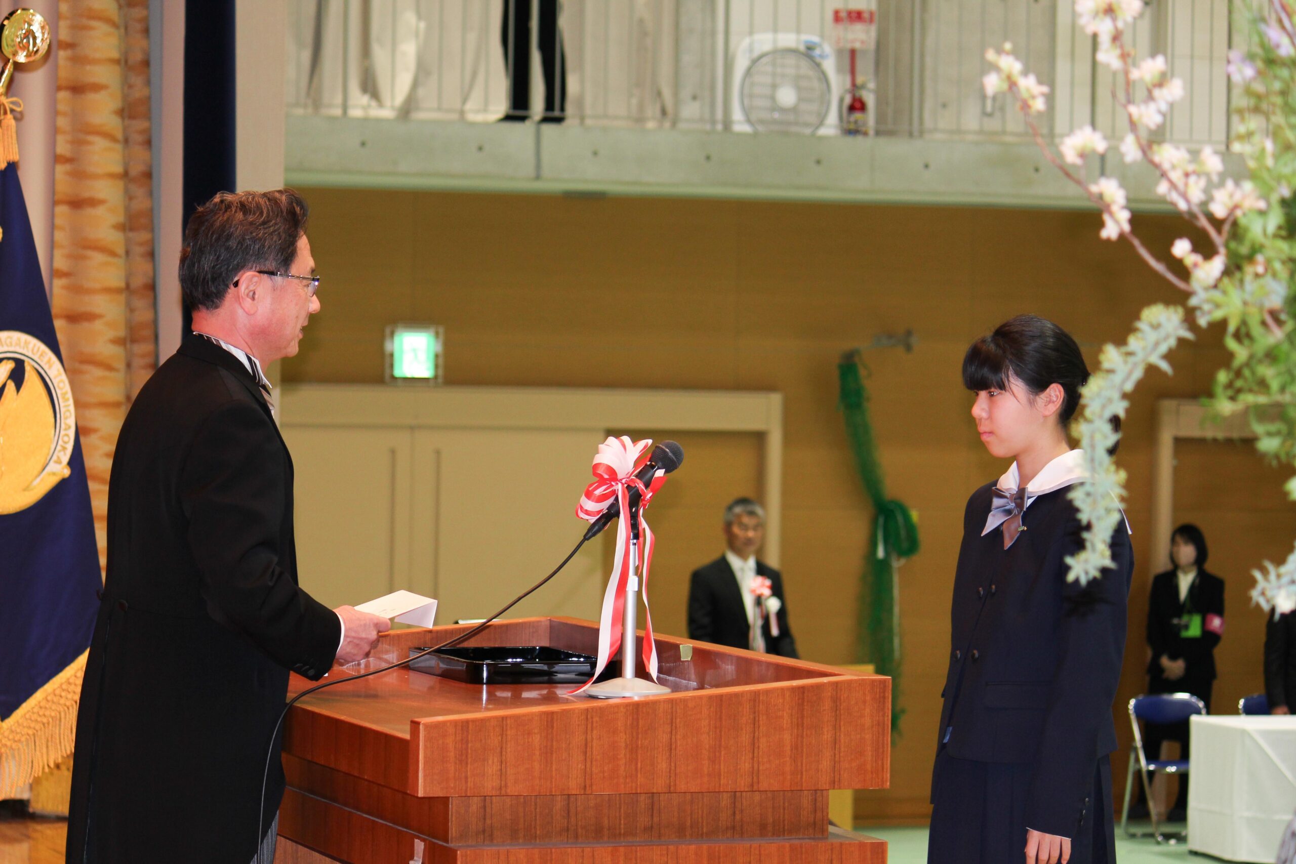 在校生代表からは新入生に、「中学・高校生活は本当にあっという間に過ぎていきます。「6年間もある」と思って、ただ何となく時間を過ごすのはもったいないことです。今日という日は今日しかありません。今という時は今しかありません。自分の夢を、掲げた目標をしっかり見据え、全力で取り組む6年間にしてください。」と、先輩として素晴らしい励ましの言葉を述べてくれました。新入生の皆さんの心に響いたことと思います。