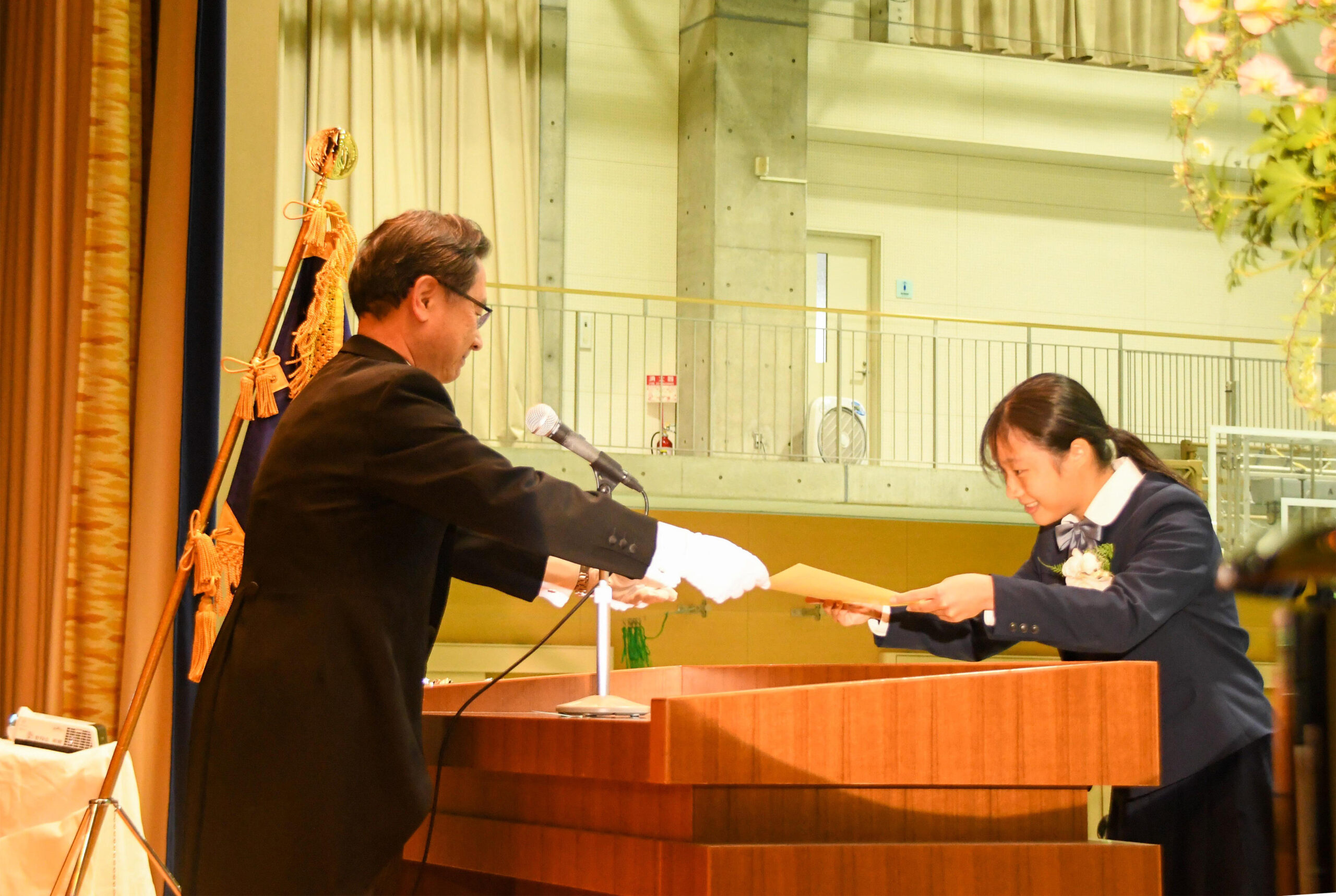 卒業式では本校室内楽部の心に響く式典演奏の中、一人一人に卒業証書を手渡し、おめでとうと声をかけました。笑顔でありがとうと返してくれる人、真剣な面持ちで頭を下げる人、感動で胸いっぱいになっている人と表情は様々でしたが、皆、それぞれの思いを胸に卒業証書を受け取ってくれました。