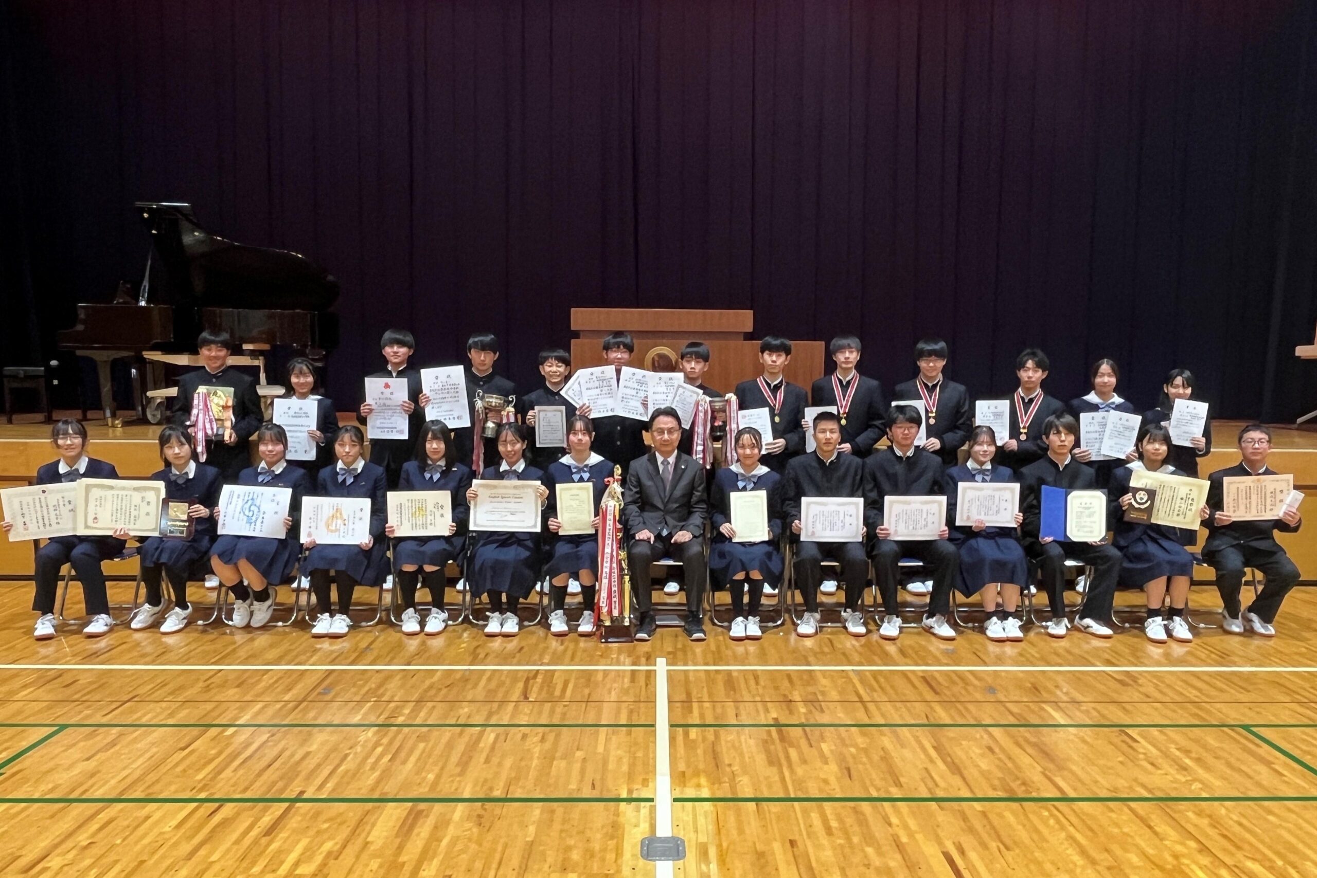 式に先立って、2学期に開催された運動部・文化部の各種大会・コンテストの入賞者と英語弁論大会・書道大会、人権作文・税の作文の入選者など合わせて28名の生徒に賞状を伝達しました。