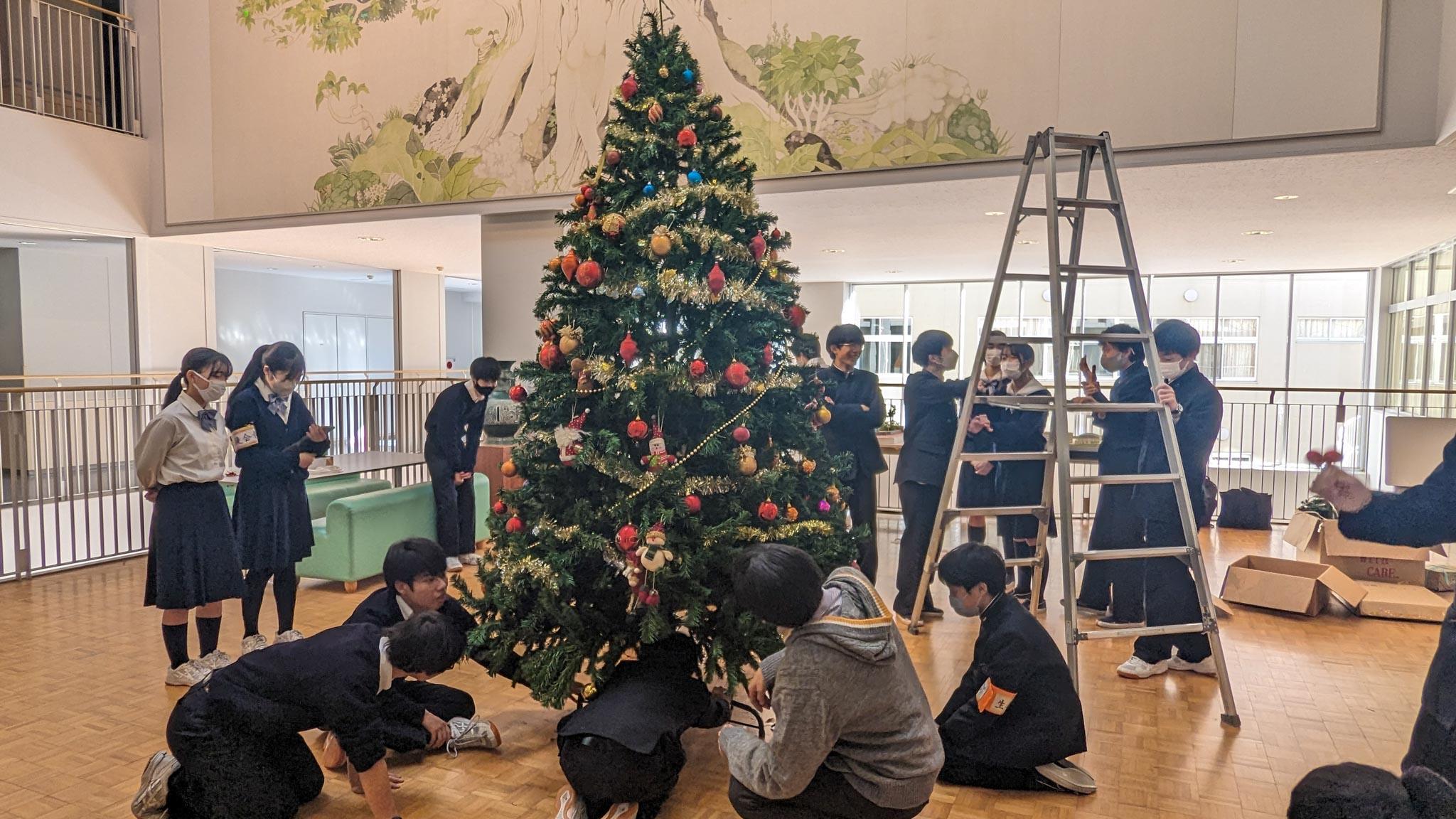 クリスマスが近づき、今年もサイエンスホールにとてもきれいなクリスマスツリーが美しい光を放っています。また校舎の階段には赤と青の飾りモール、Yダイニング前にツリーとサンタと雪だるまのオブジェ、プロムナードの電飾と生徒会本部役員の皆さん、文化委員さんそして有志の皆さんが協力して丹精を込めて飾ってくれました。