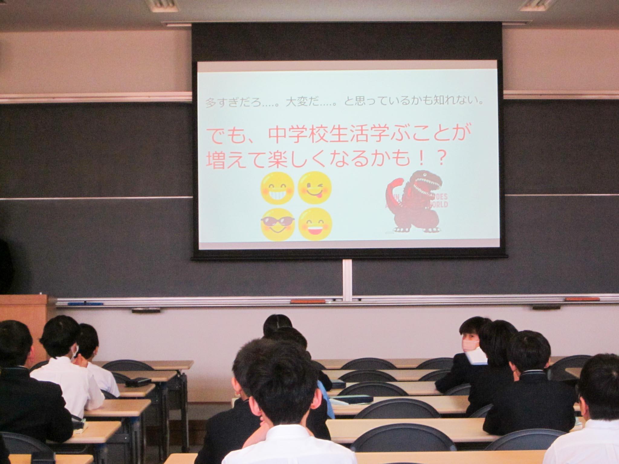 Y1生の2組目の生徒からは、M2(小6)生全員へ、中学校で定期考査を受験する際の勉強の仕方をアドバイスしてくれました。また、勉強だけではなくクラブ活動もいろいろあり自分のあったクラブ活動に入って楽しもうと呼びかけてくれました。