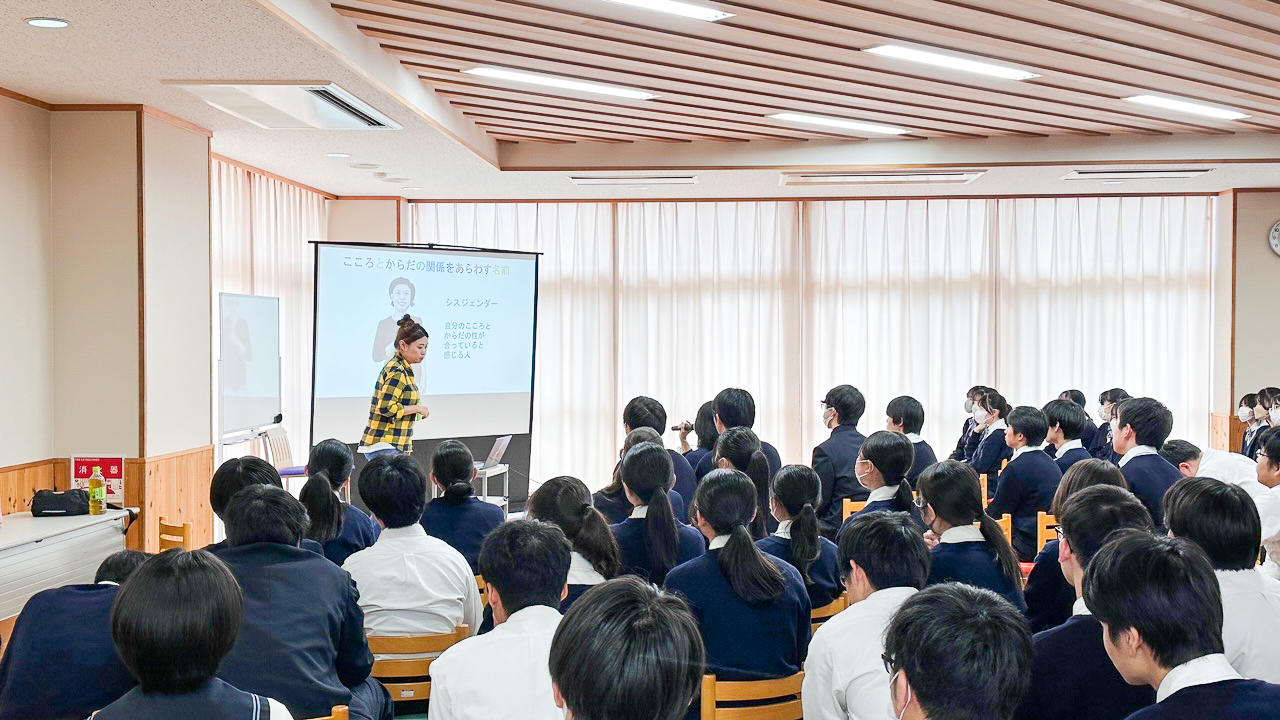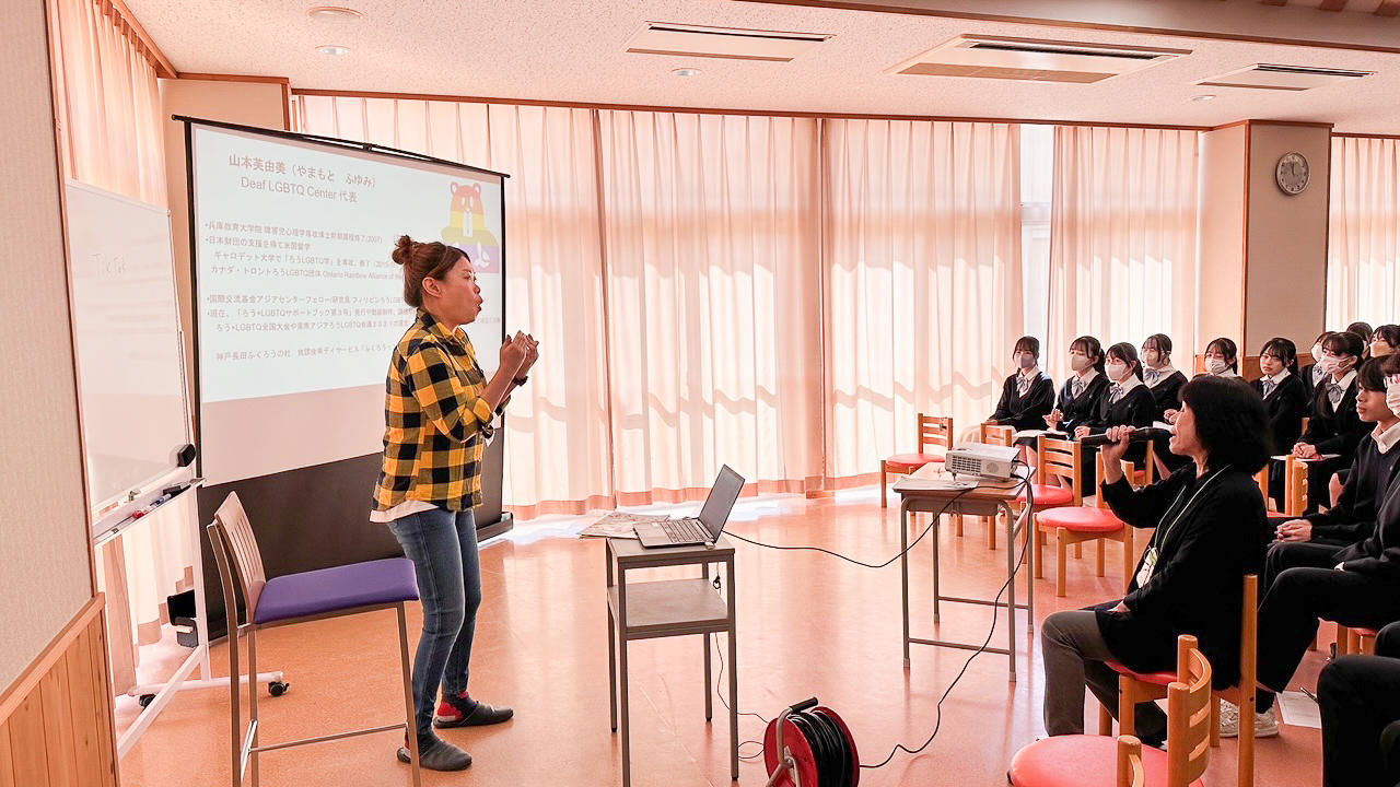 この講演会は、生徒たちにとって本校での人権学習の最後のとりくみになります。2018年から毎年、Deaf-LGBTQ Centerの山本芙由美さんをお招きしてお話を伺っています。