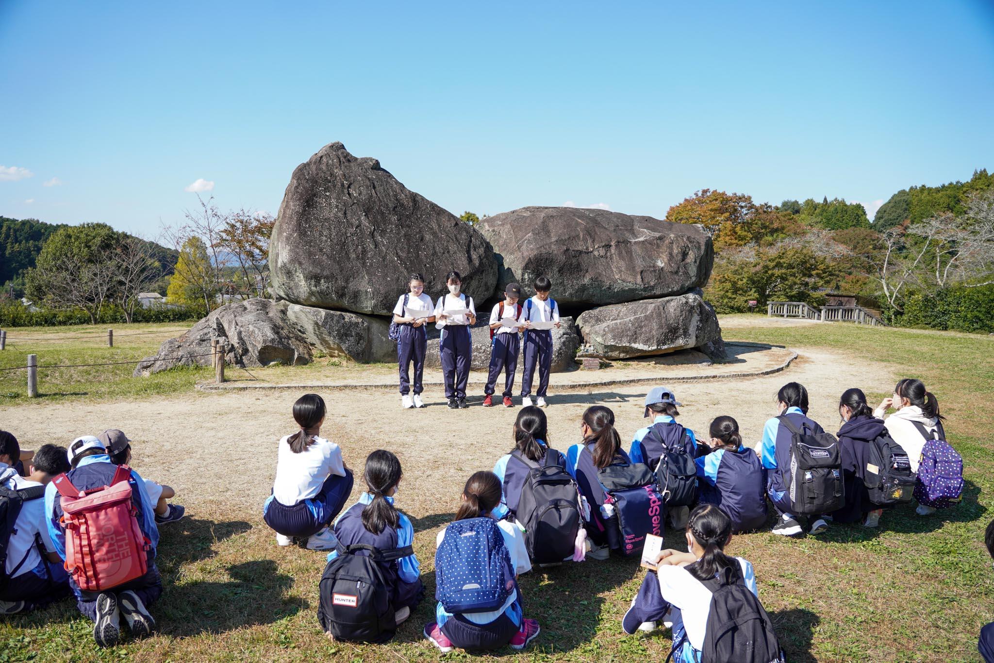 行程としては、まず飛鳥駅から高松塚古墳に向かい、その後は鬼の雪隠・俎、天武・持統天皇陵、亀石、橘寺を経た後、昼食会場である石舞台古墳へと移動しました。もちろん事前に学習していた場所を実際に目で見ることに喜びと感動はあったことと思いますが、やはり生徒たちが一番生き生きとしていたのは昼食時間でした。友達とビニールシートを広げ、突き抜けるような秋晴れの下、鮮やかな緑の芝生の上で食べる昼食は格別だったようです。