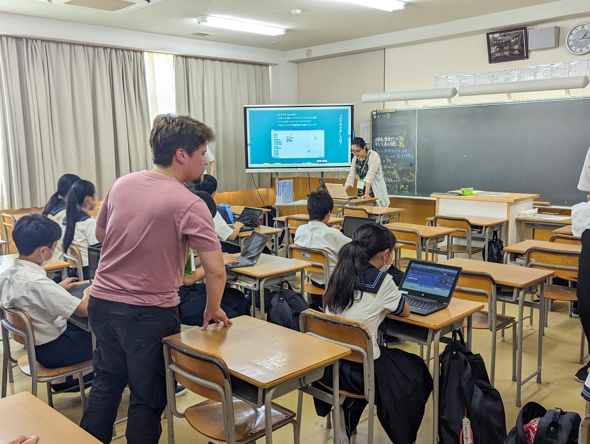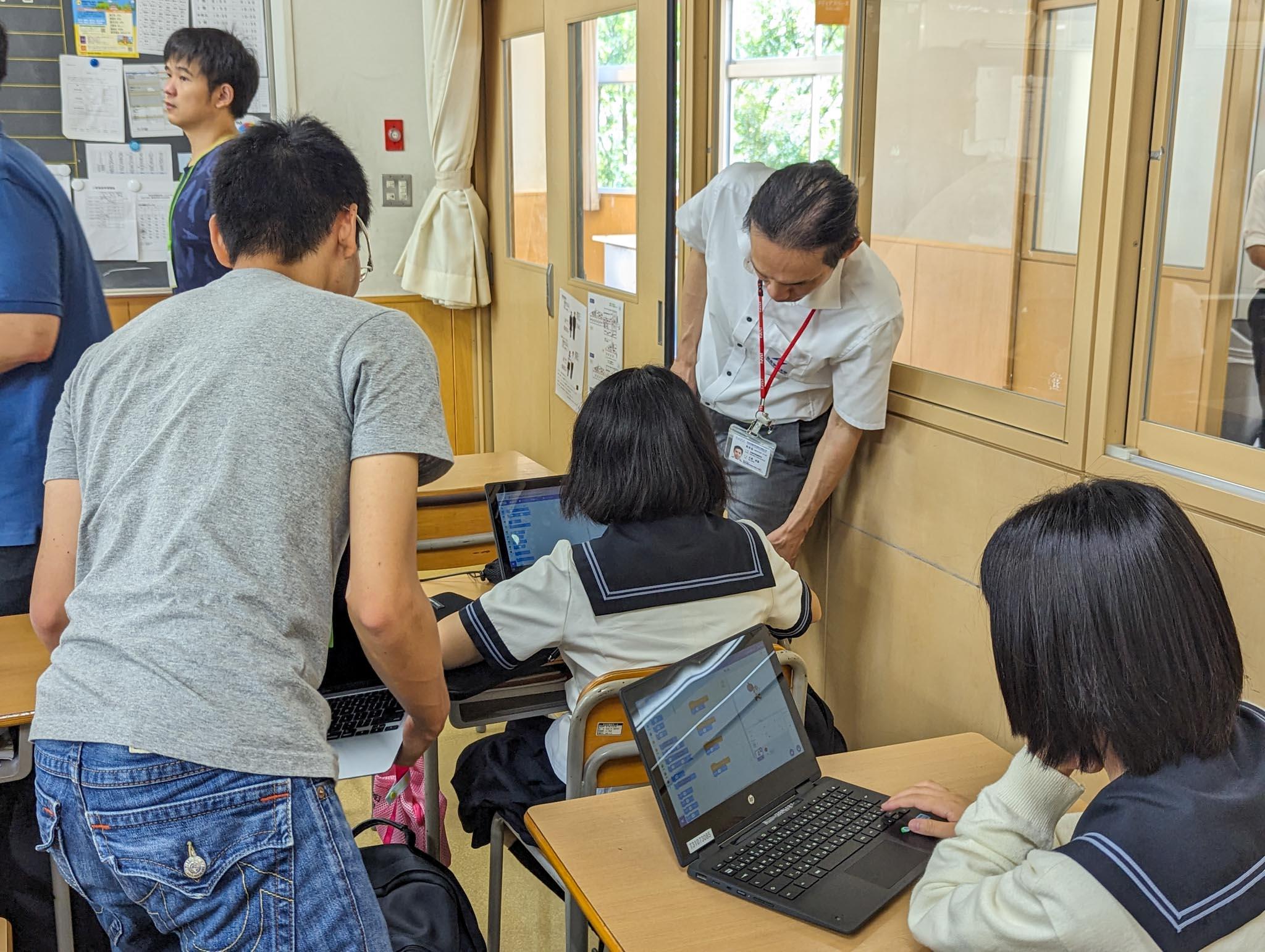 その後、生徒たちは画面の背景を変えたり、文字を入力したりと様々なプログラムの作り方を教わりながら、各自がゲームを作りました。また、インベーダーゲームやブラックジャックなど既存のゲームに類似したゲームのプログラミングに取り組んだり、音にこだわってゲームをプログラミングするなど、試行錯誤を繰り返し、失敗しながらも自分で考え、楽しみながら貴重な経験をすることができました。