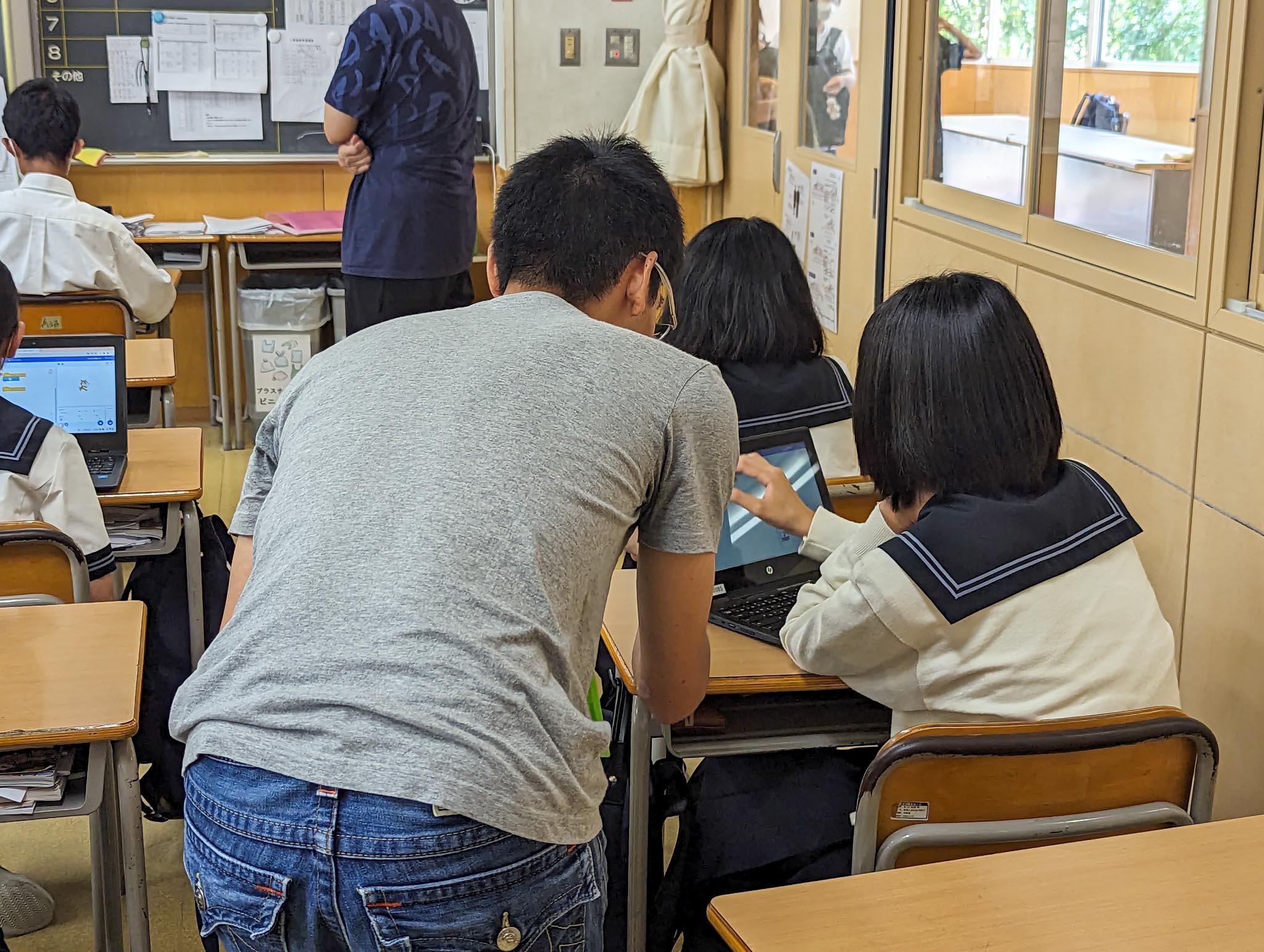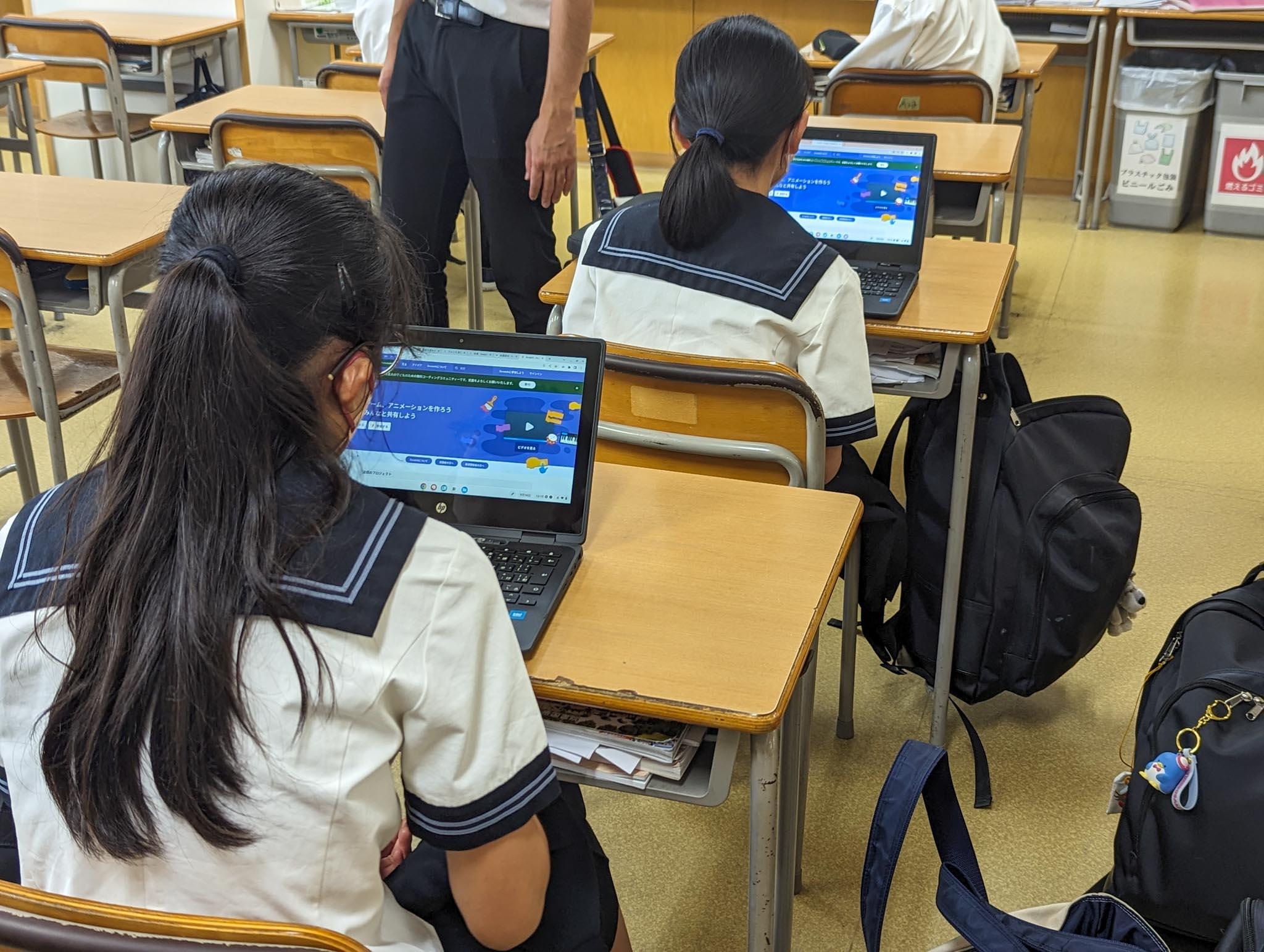 9月16日、M3、M4(中1、中2)を対象に奈良先端科学技術大学院大学の教授と学生ボランティアの方に来校いただき、ビジュアルプログラミング言語「Scratch」を用いたプログラミングの導入体験をさせていただきました。