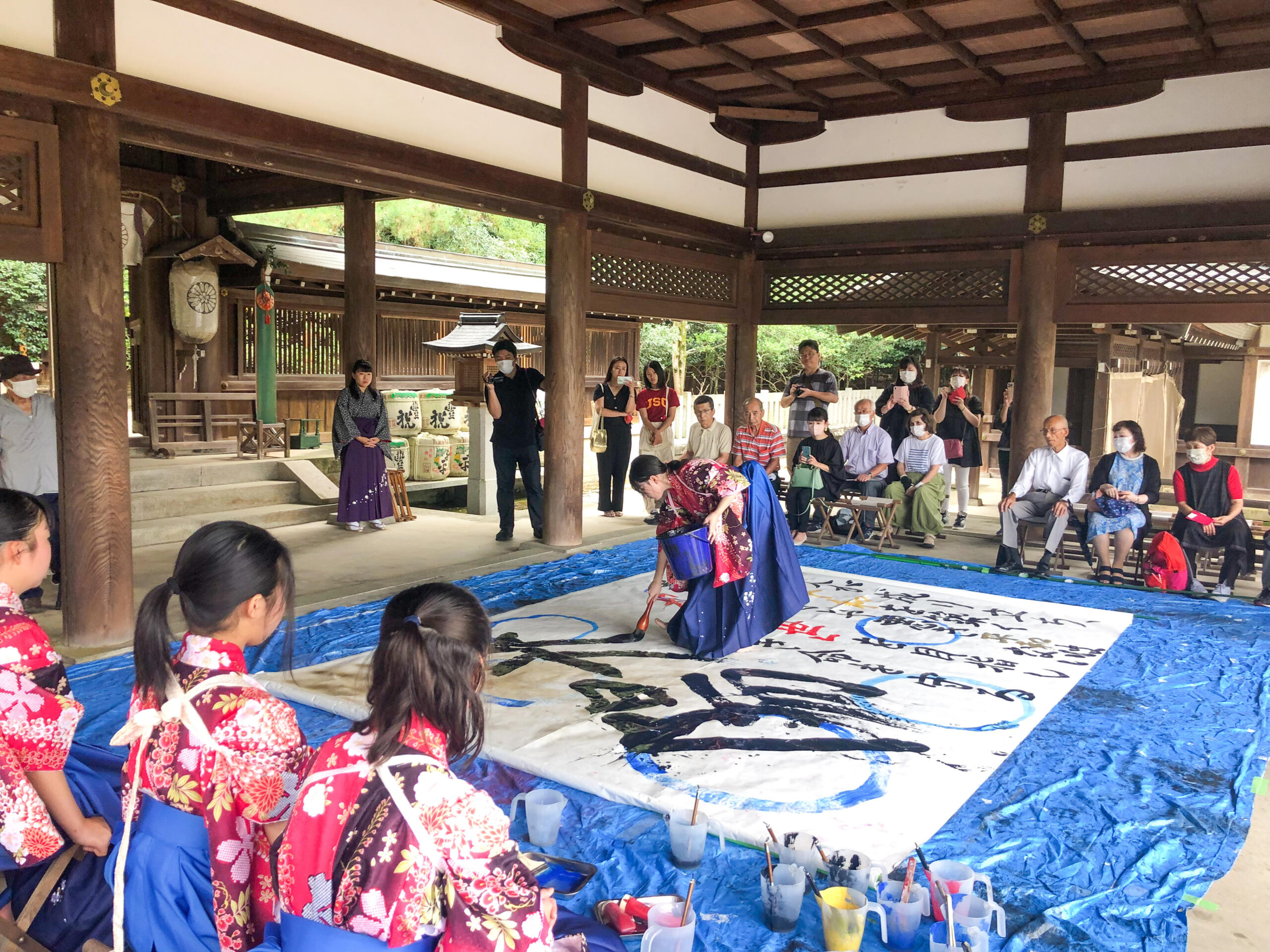 この催事には、第5回から参加していますが、新型コロナウイルス、台風の影響で、神社に於いて直接揮毫できたのは今回が初めてでした。緊張した表情にも見えましたが、振り袖と袴を身にまとった部員達の振る舞いは堂々としており、ご覧いただいた方々にもパワーが伝わったものと思います。