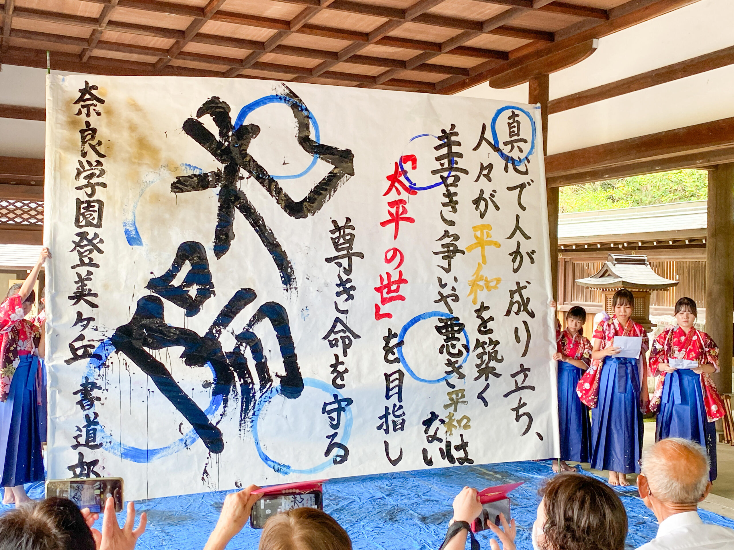 9月18日、「第7回9.21世界平和の祈り」が、国際平和デー(9/21)に先駆けて、奈良県護国神社で開催されました。その式典に本校書道部員8人が参加させていただき、平和メッセージを揮毫し、奉納いたしました。