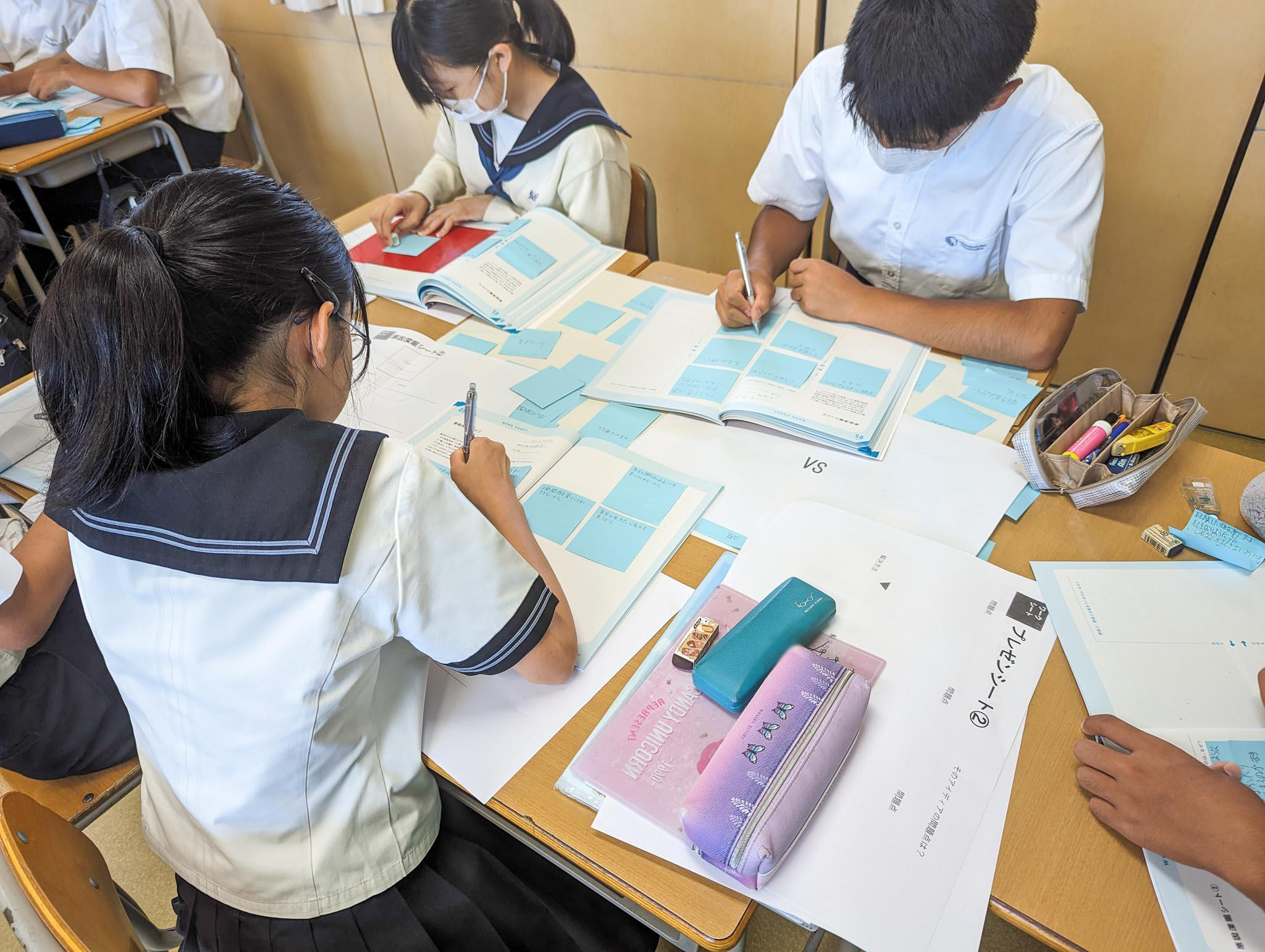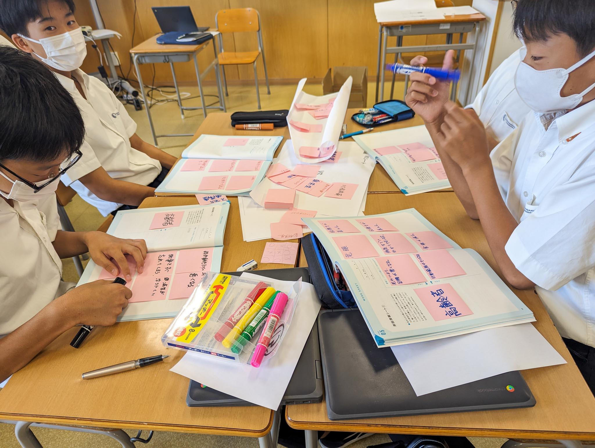 M3では、ハチ高原での探究学習を踏まえ「今後は何について探究したいか」というアンケートを行い、そこで出た、①新しい教科を作るなら何を考えるか? ②勉強が楽しくなるためにはどうしたらいいか? ③一番魅力的で学びにつながる修学旅行の行き先は? ④新しく校則を作るとしたら何がいいか? ⑤新しい文房具を開発するならどんなものがいいか? の5つのテーマにクラスを解体したグループでアイデアを出し合いました。自由で柔軟な発想力と表現力が発揮された楽しい時間となりました。