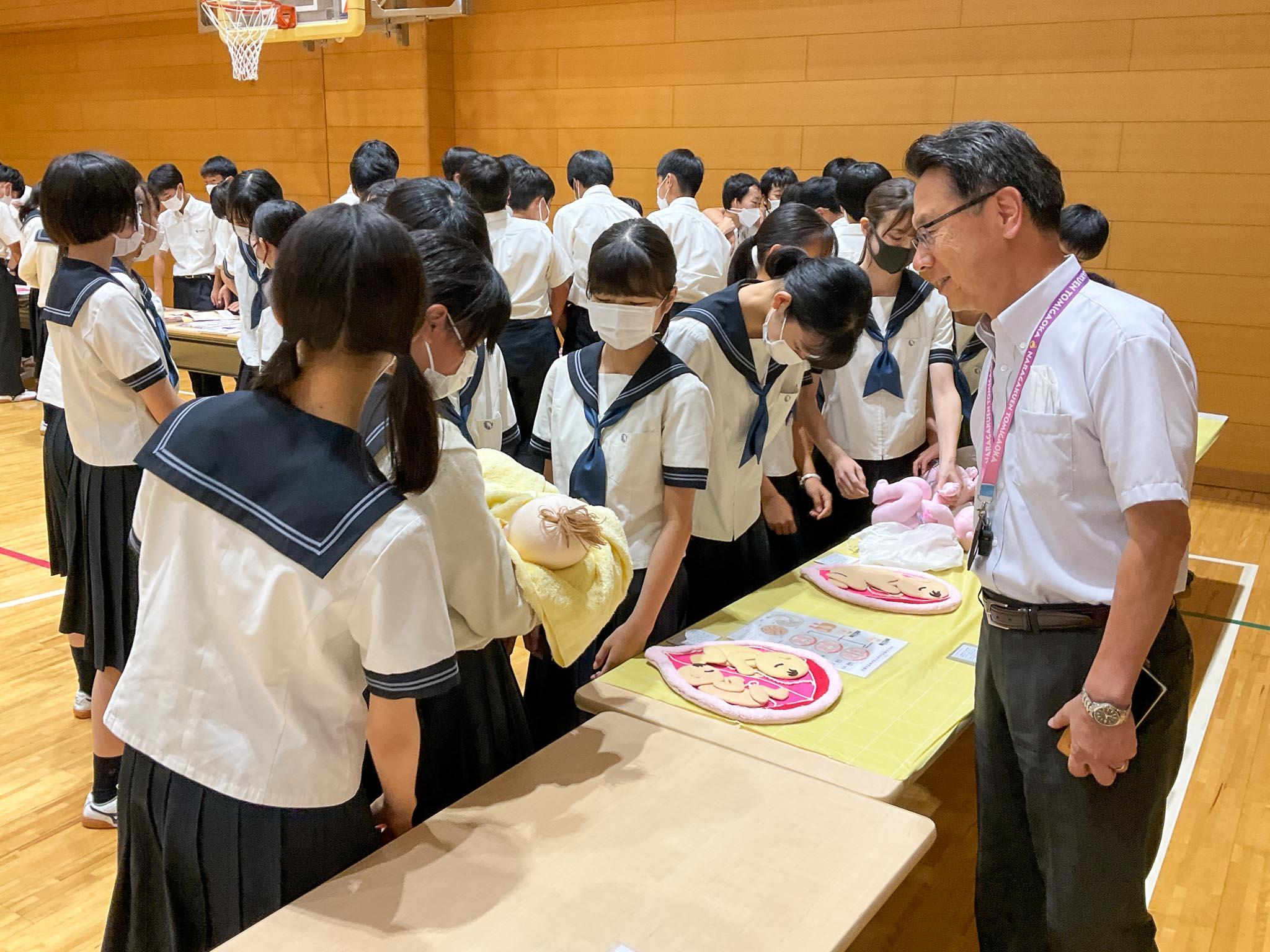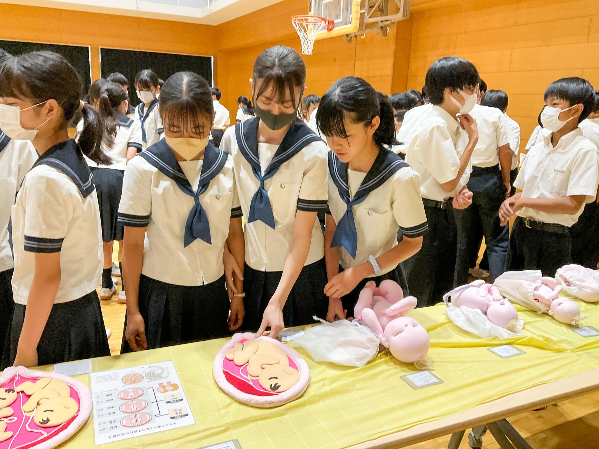 赤ちゃん人形を使っての「赤ちゃん抱っこ」、妊婦体験ジャケットを付けた男子生徒と男性教員による妊婦体験や帝王切開となったご家族の出産ドキュメントの視聴もあり、様々な視点から命の大切さを学びました。