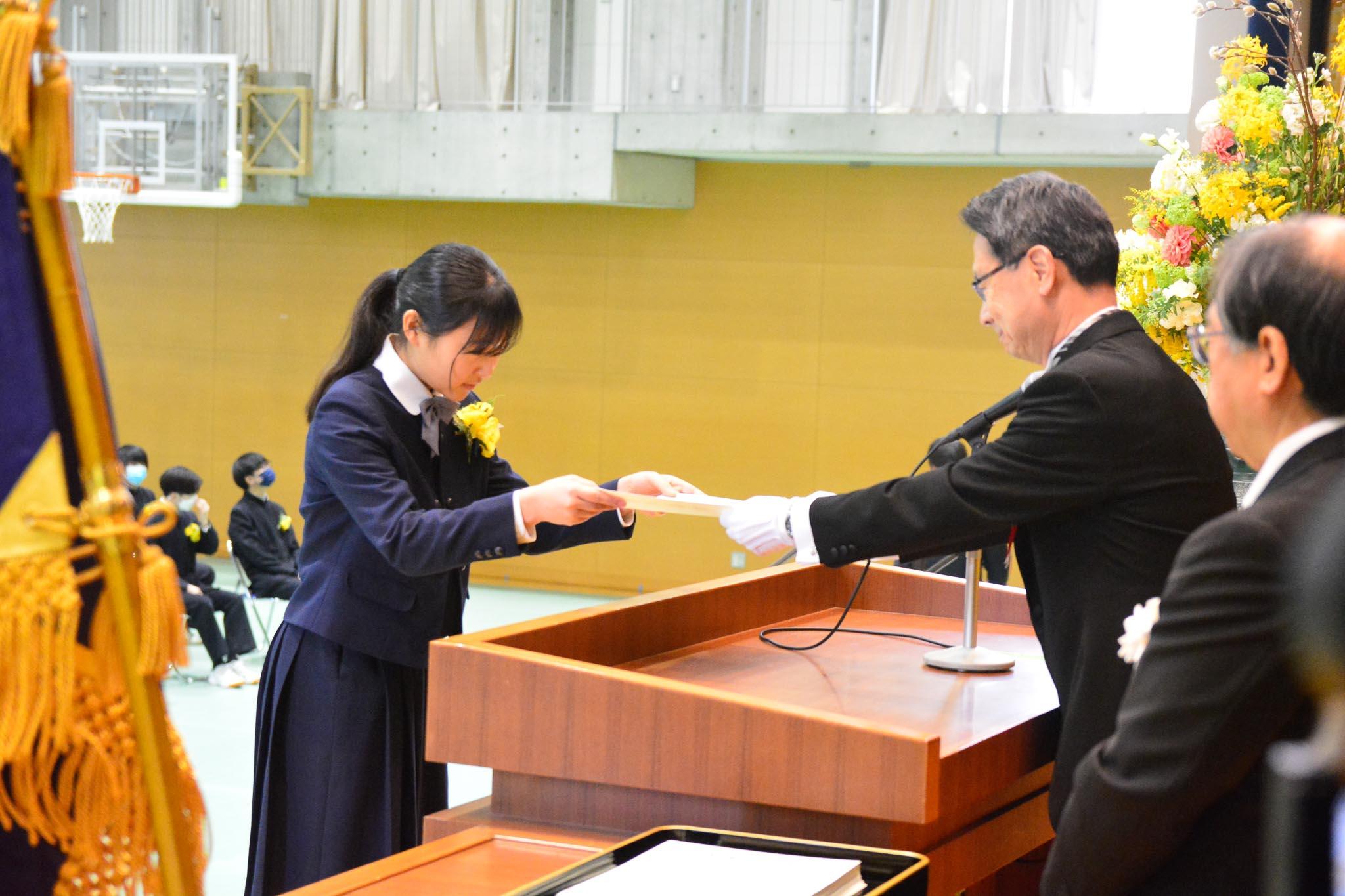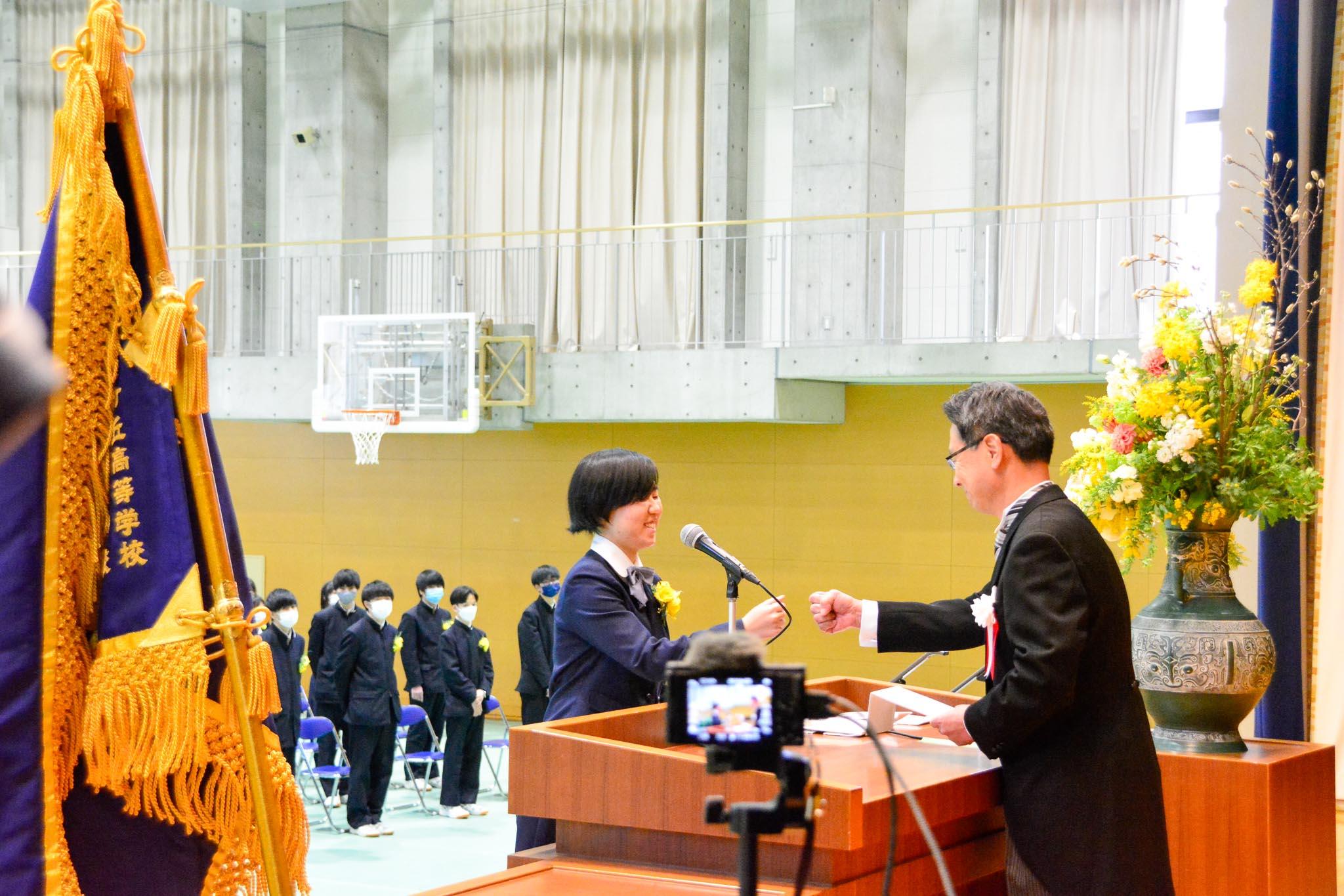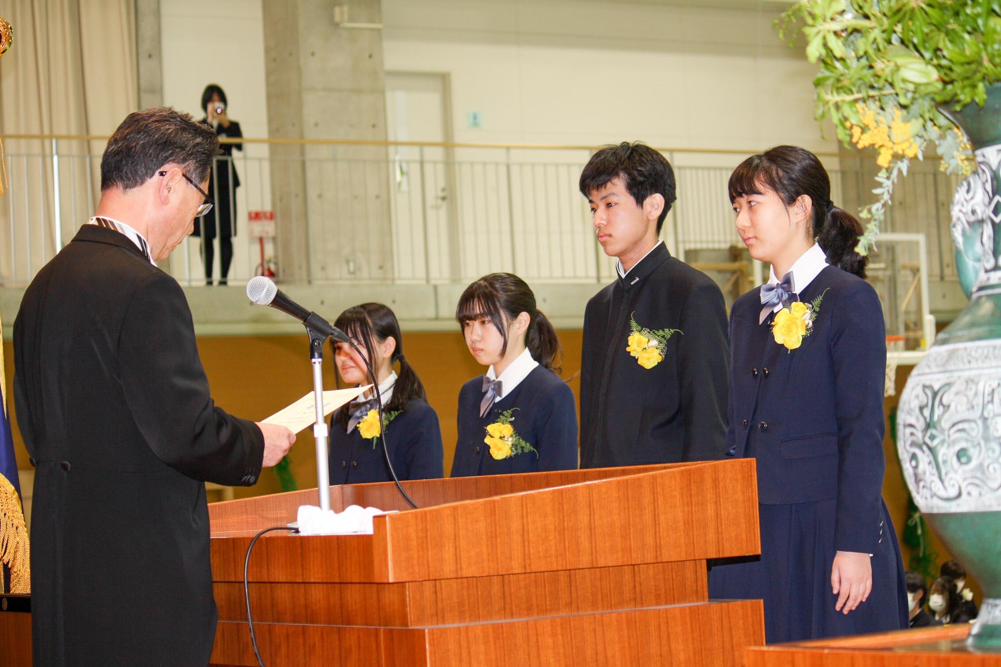 答辞では、「どの先生も私たちと真正面から向き合ってくださり、先生方のお陰で踏み出せた一歩がたくさんありました。卒業を迎えた今、私たちは愛されていたのだなあという喜びを感じています。」と感謝の言葉がありました。校長からは、「『知りたい』と思う気持ちを大切にすること、志を高くもつこと、そして自分自身に軸をもつこと」をはなむけの言葉として贈りました。
