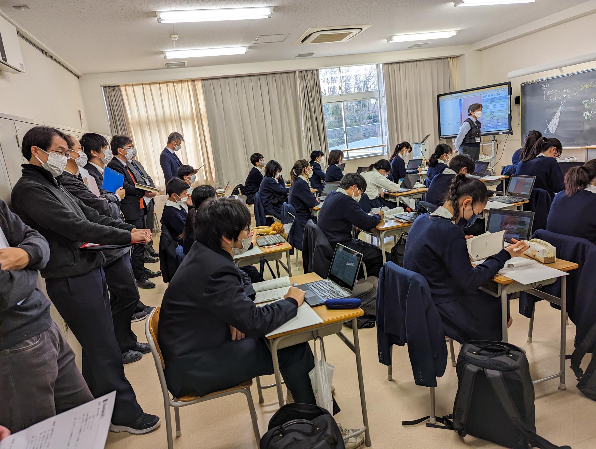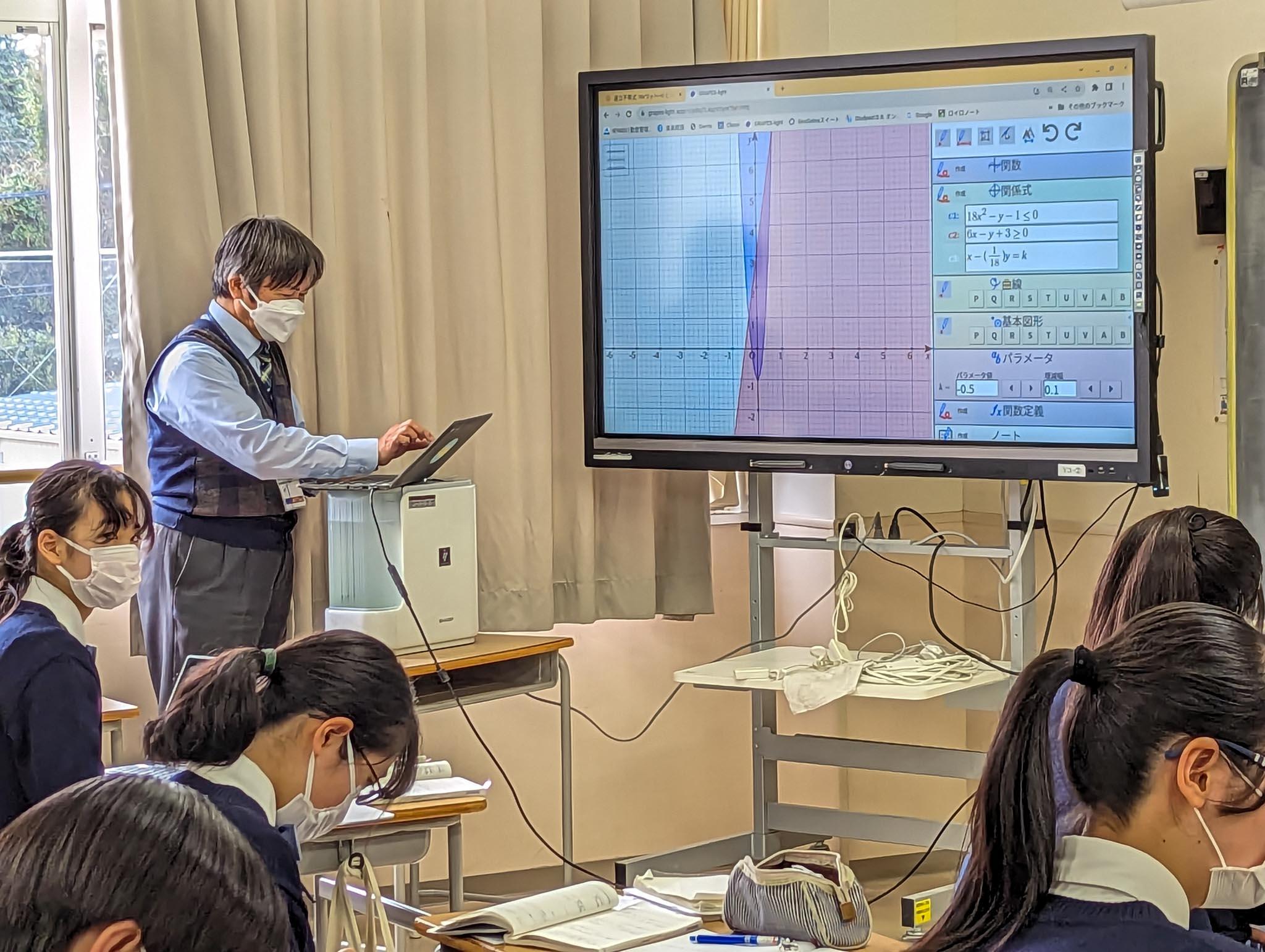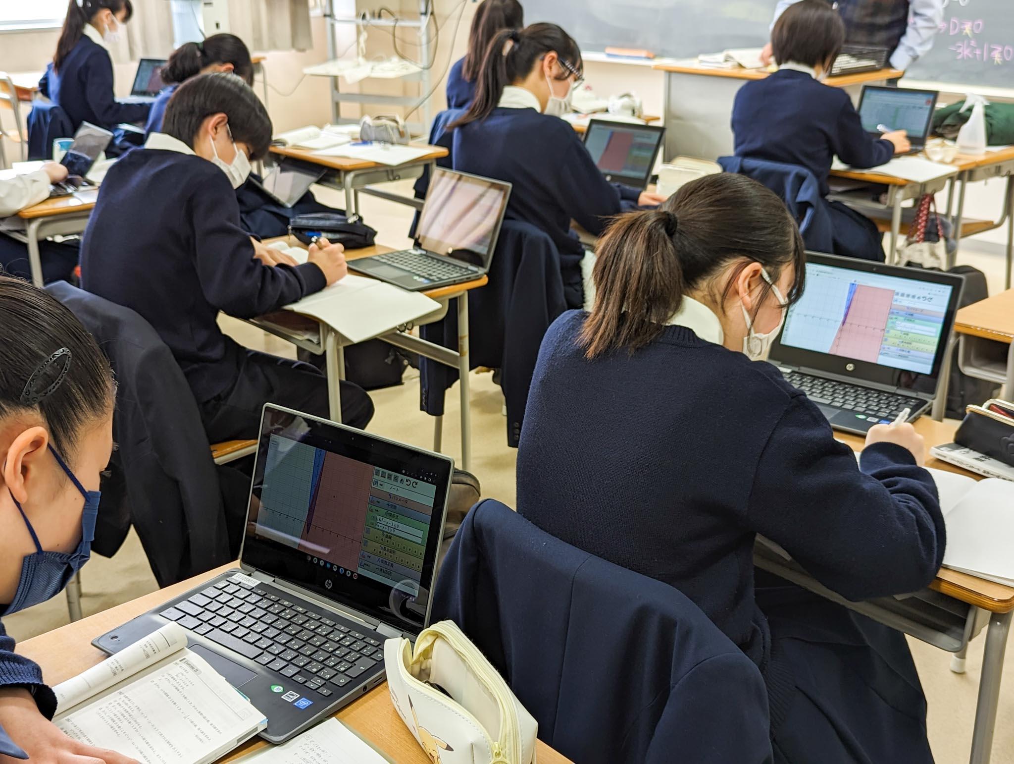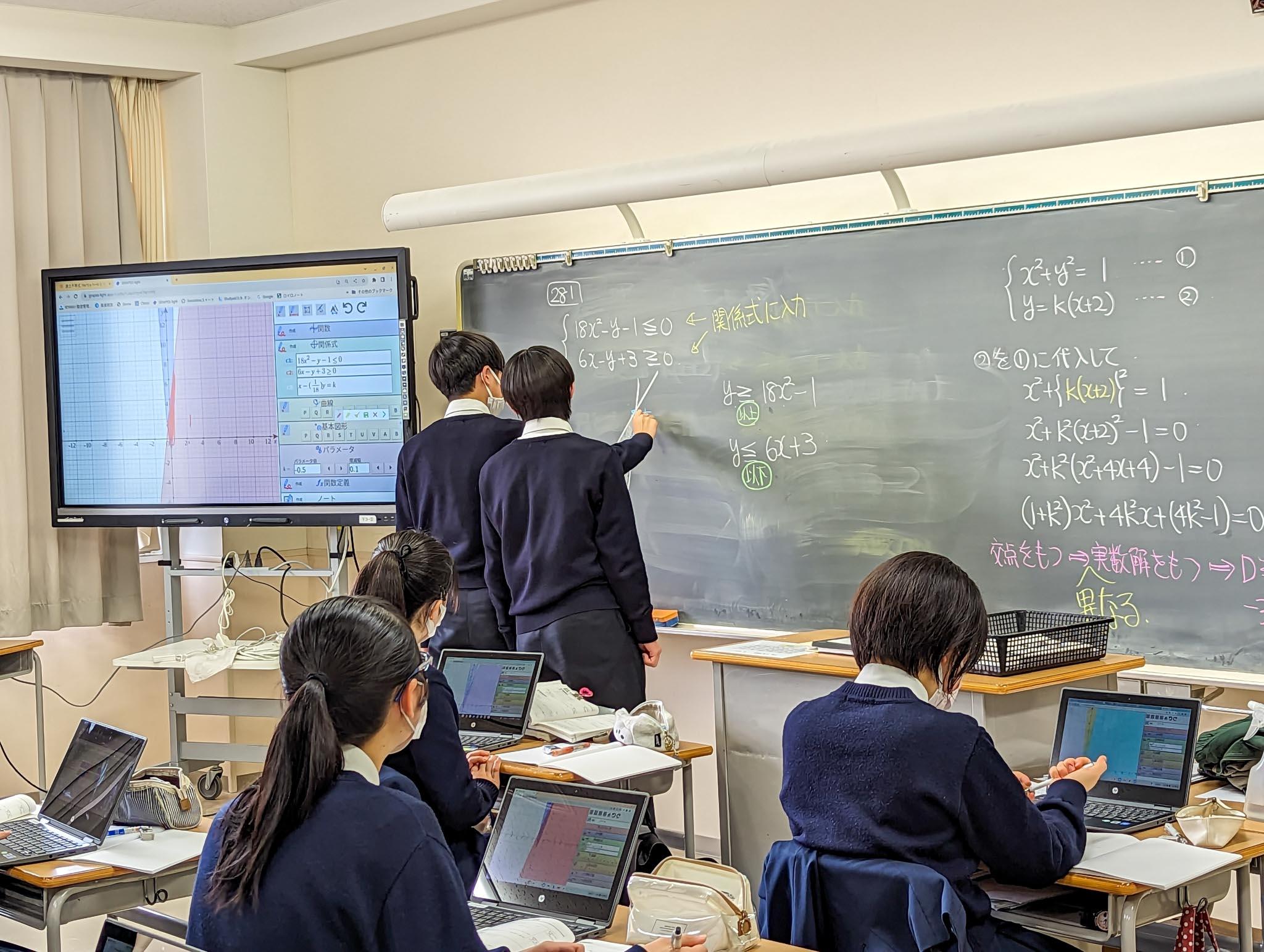 授業では、青山学院大学と同志社大学の過去問が取り上げられていましたが、生徒たちは各自のChromebookに数式を入力し、PC画面に描写されたグラフを見ながら、問題を解き進めていました。