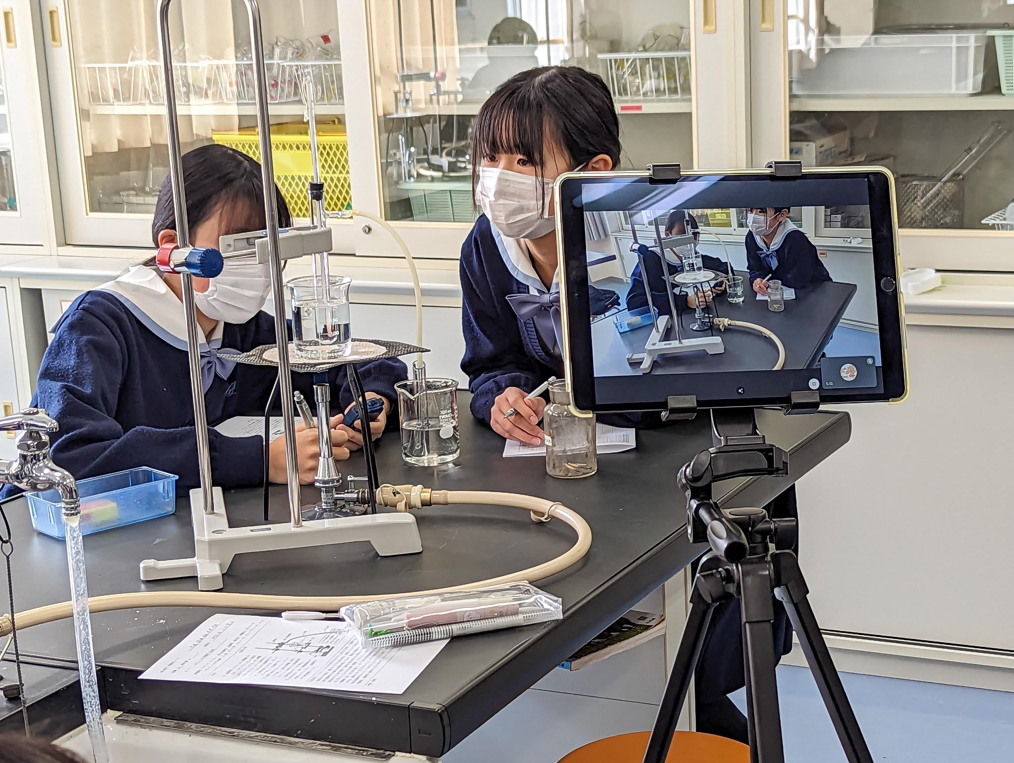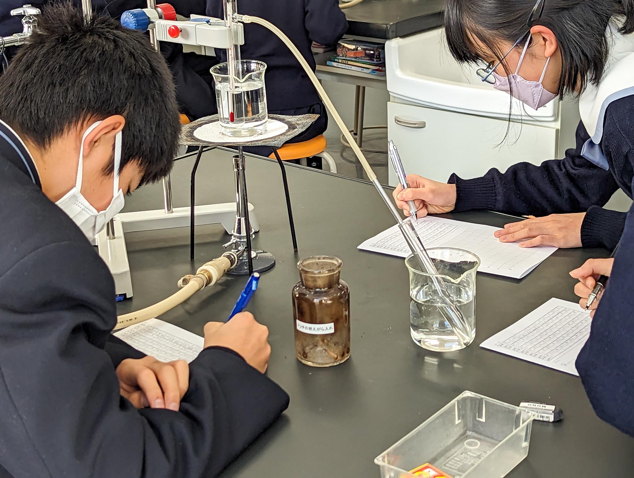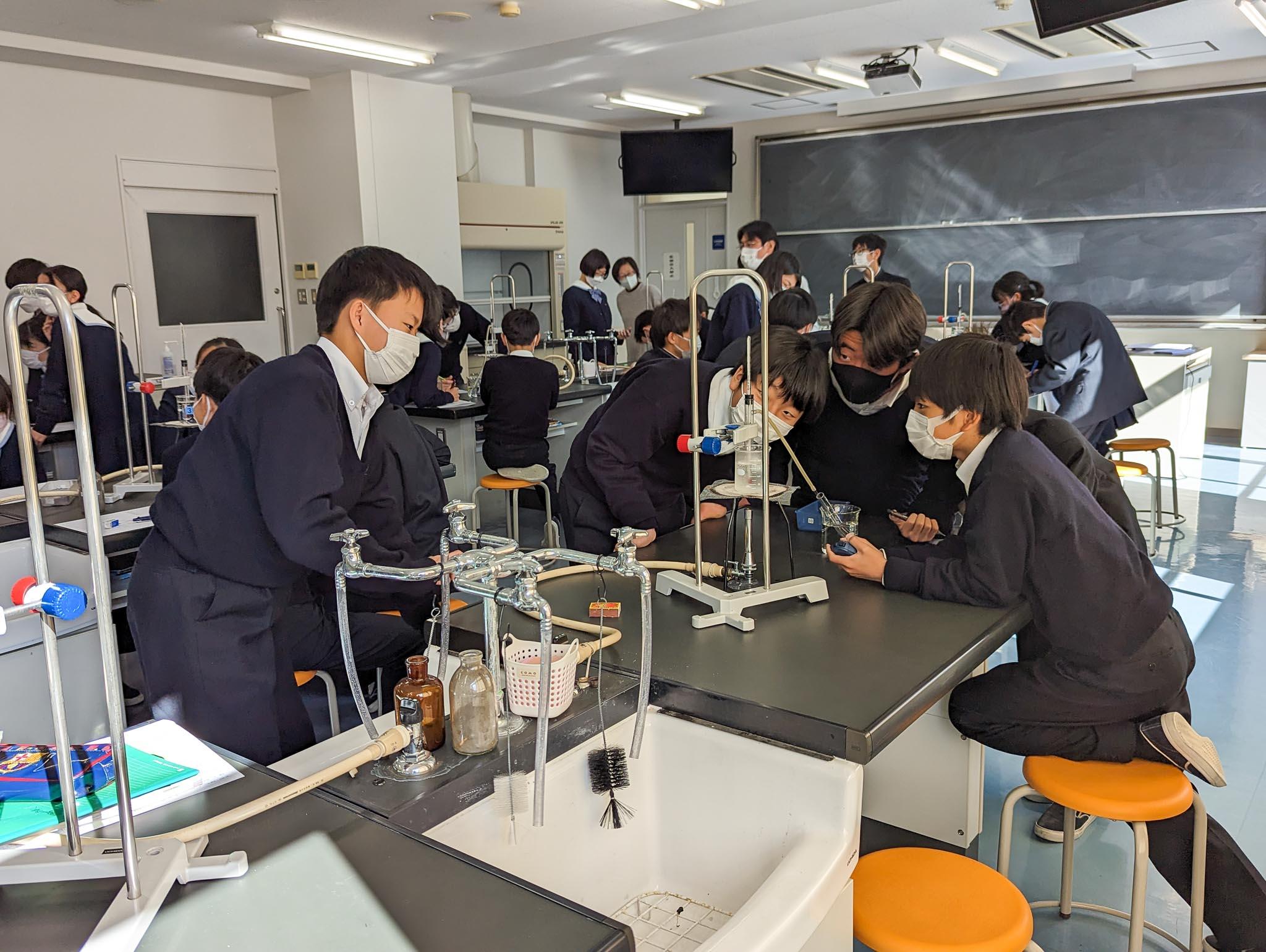 授業は通常どおりとしましたが、M3(中1)で化学の実験が行われているのを見学させていただきました。