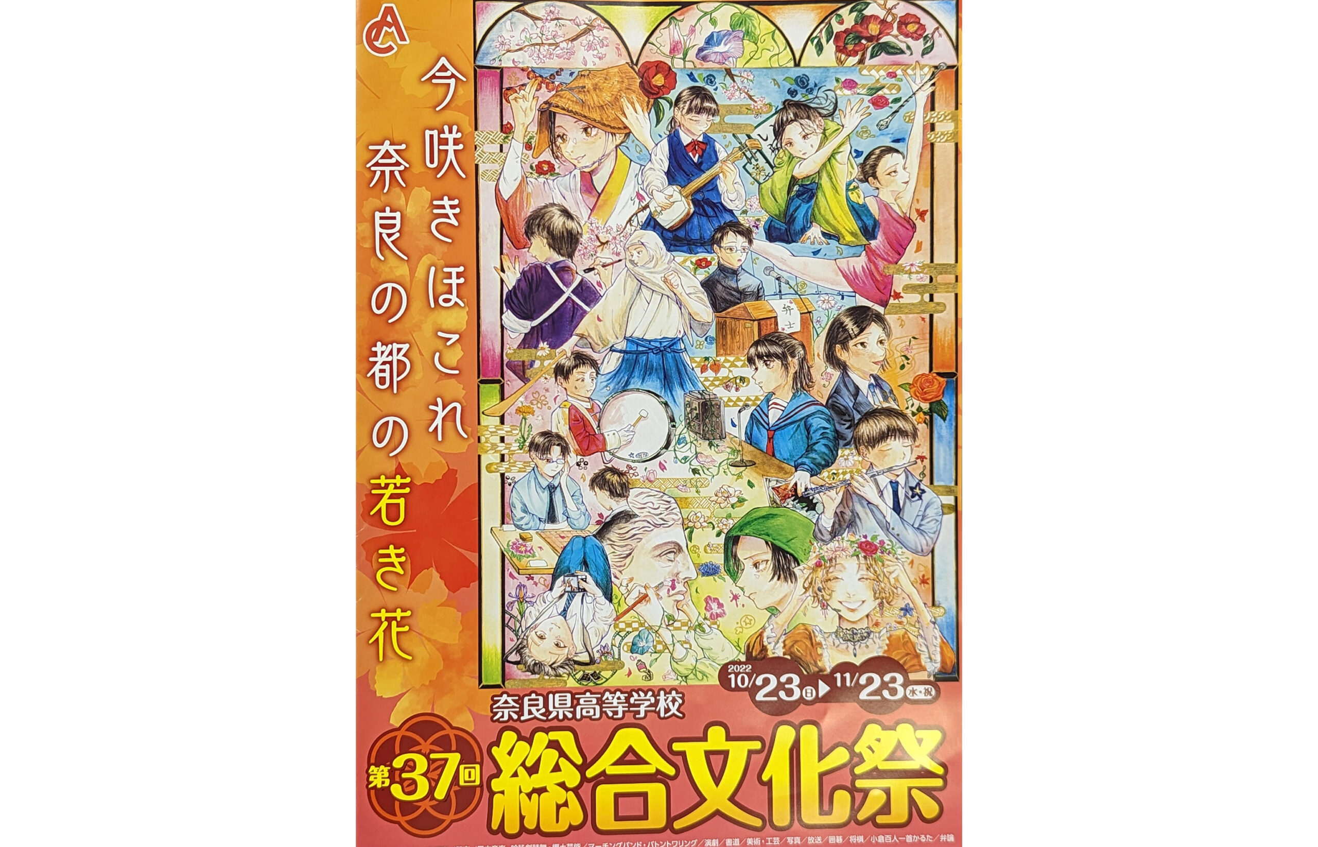 11月23日、橿原文化会館大ホールで、「今咲きほこれ 奈良の都の若き花」を大会テーマとして、第37回奈良県高等学校総合文化祭総合発表が開催されました。県内高校の文化部16部門が一堂に会して舞台発表、ロビーでの作品展示・競技演技を行いました。