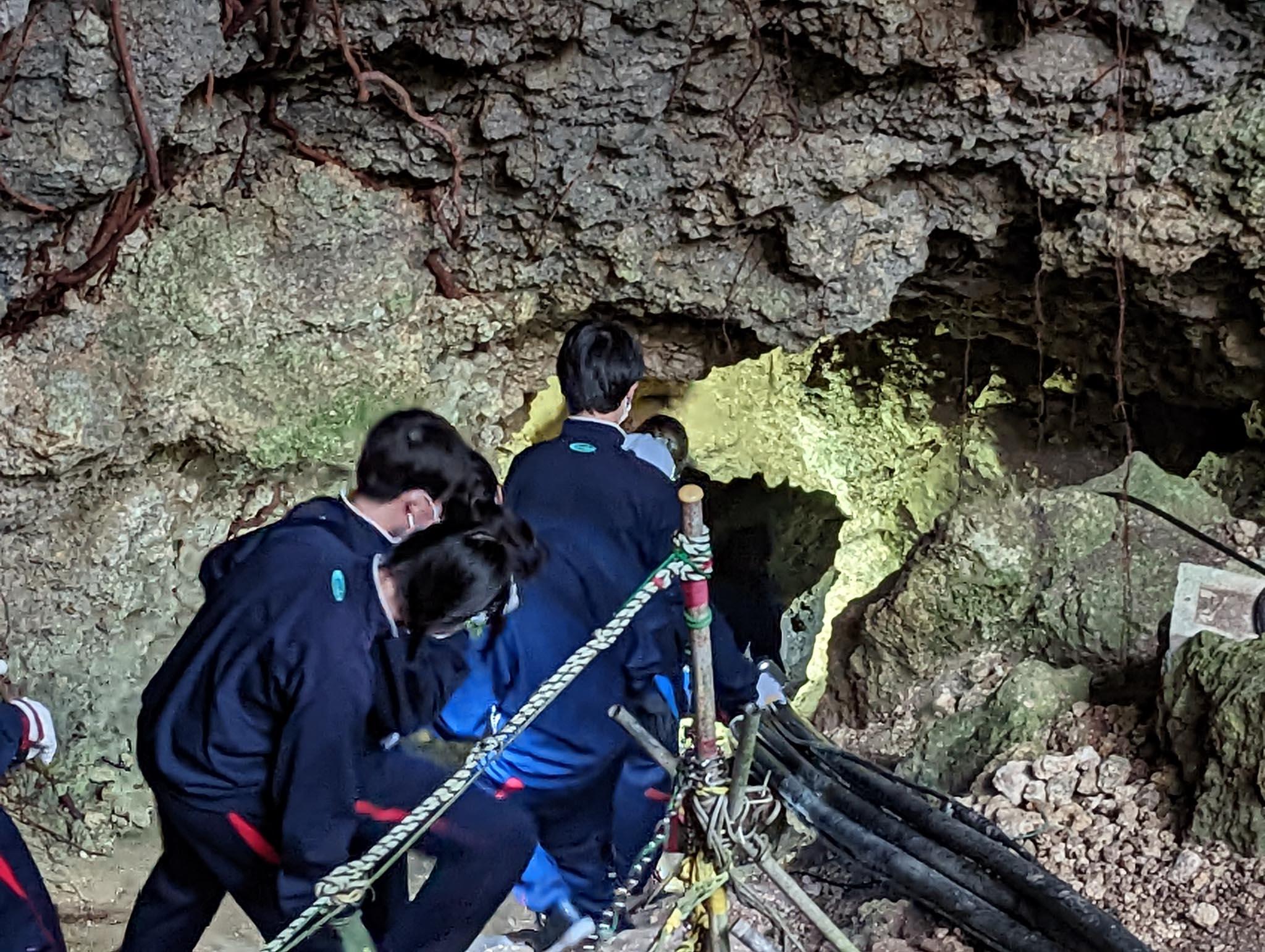 初日は、平和祈念公園・資料館とクラスごとに「壕(ガマ)」を見学しました。壕内では漆黒の暗闇も体験し、避難壕や野戦病院として利用された痕跡を確認しました。案内してくださった78歳の方は、1歳の時に壕内で祖父を亡くされたことを思い、本校生徒たちがとても真剣にまた素直に話を聞いてくれたことに感激され、「この若者たちが平和な世の中をつくってくれるよと伝えたい。」と話しておられました。