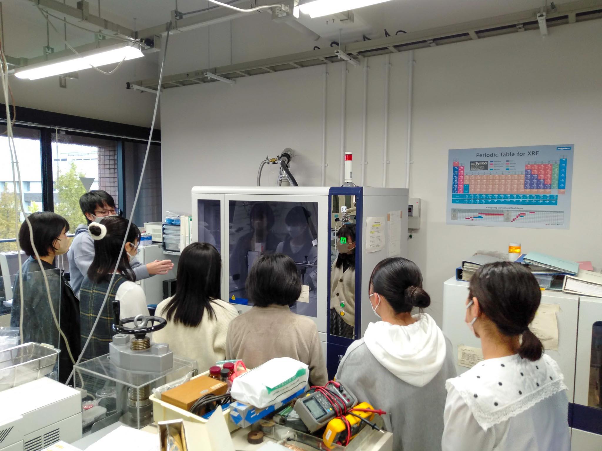 初めに理学研究科セミナーハウスにて、京大の先生方より京都大学理学部の紹介と「非平衡合成法による新規ナノ合金触媒開発」というテーマで研究紹介をしていただきました。続いて、大学院生の案内で実際に研究室を訪問・見学させていただき、最先端の研究を間近で見て実感することで大変刺激を受けただけでなく、漠然としていた大学生活のイメージを膨らませることができました。